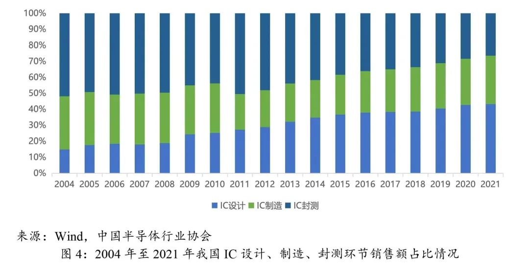 根据中国半导体行业协会数据,2021年中国IC产业设计、制造、封测环节销售额分别占43%、30%和26%。其中,IC设计环节销售额占比自2004年以来不断提升;制造环节销售份额在2011年前后时间出现局部下降,此后回升至30%,份额占比趋于稳定;而产业链价值较低的封测环节,则呈现持续下降趋势。这一定程度上体现了我国在IC产业链的分工不断向中上游拓展的趋势。