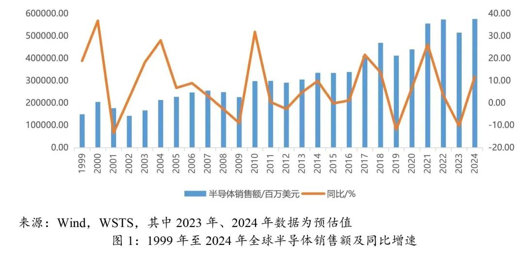 受宏观、技术、政策、供需等多重因素共同影响,全球半导体产业在波动中增长,呈现出螺旋式上升趋势,从爆发式增长的新兴产业逐渐发展成为渐进式前进的成熟产业。
