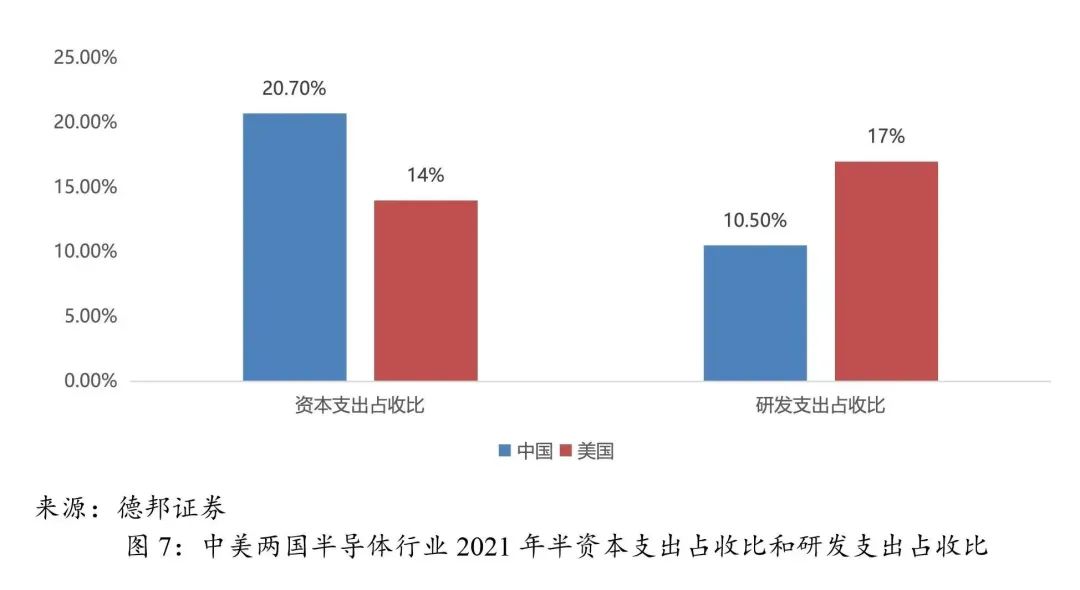 我国半导体产业最初承接的只是产业下游封装测试环节产能,因此资本支出一直保持较高水平,2021年我国A股半导体上市公司整体资本支出占收入比约20.7%,而美国半导体行业资本支出整体上在8%-20%之间波动,2021年为14%。研发支出方面,我国近年来半导体行业研发支出占收入比持续提升,2021年达到10.5%,而美国半导体行业研发支出占收入比重基本保持在16%-20%。整体来看,我国半导体行业依然处于产业链的中下游环节,与美国仍存在一定差距,仍需不断加强技术研发投入。