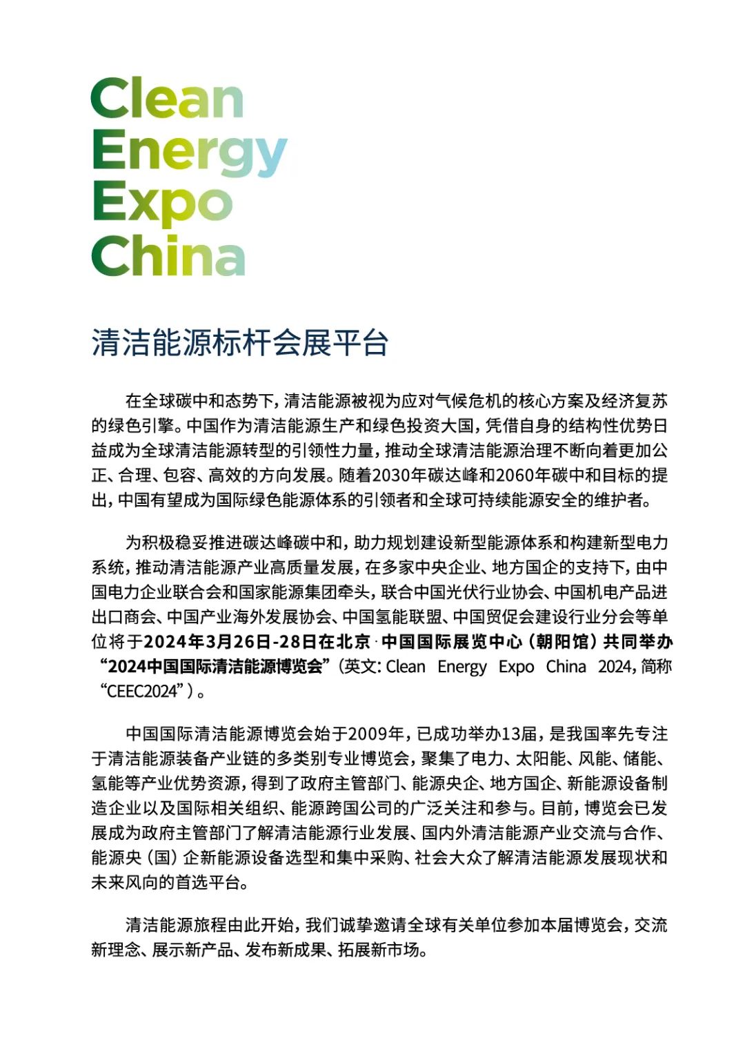 2024中国国际清洁能源博览会(英文: Clean Energy Expo China 2024,简称“CEEC2024”)定于2024年3月26日-28日在北京·中国国际展览中心(朝阳馆)举办,现筹备工作全面启动。