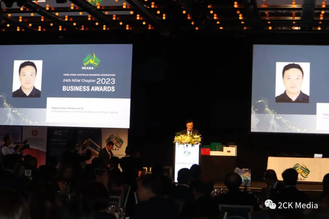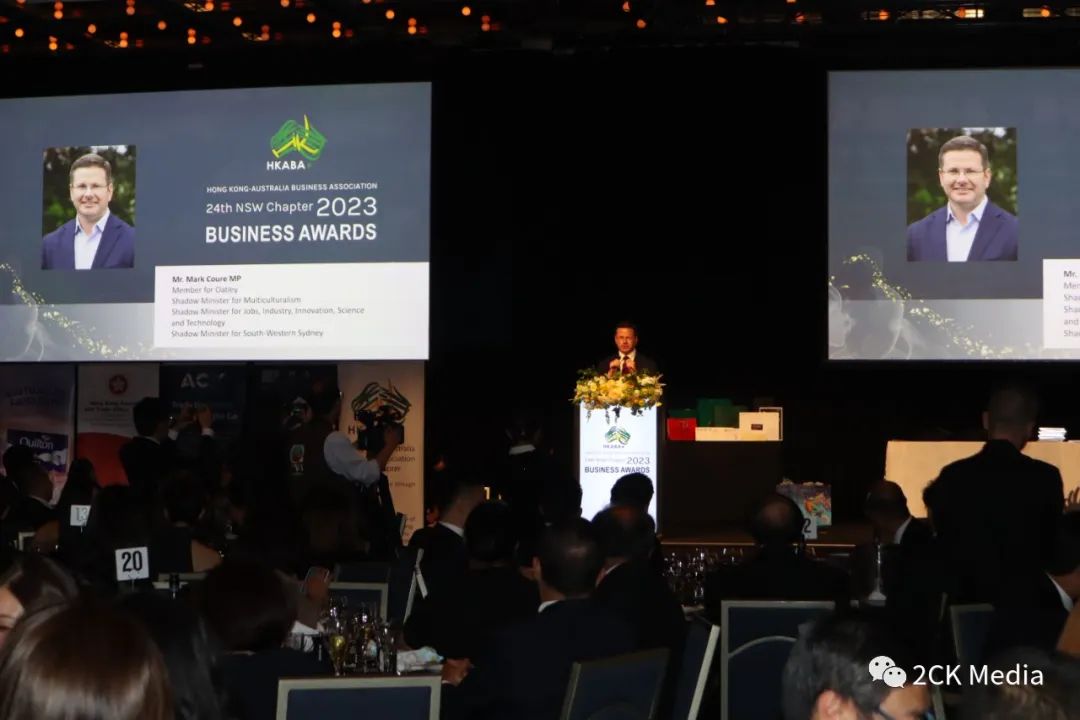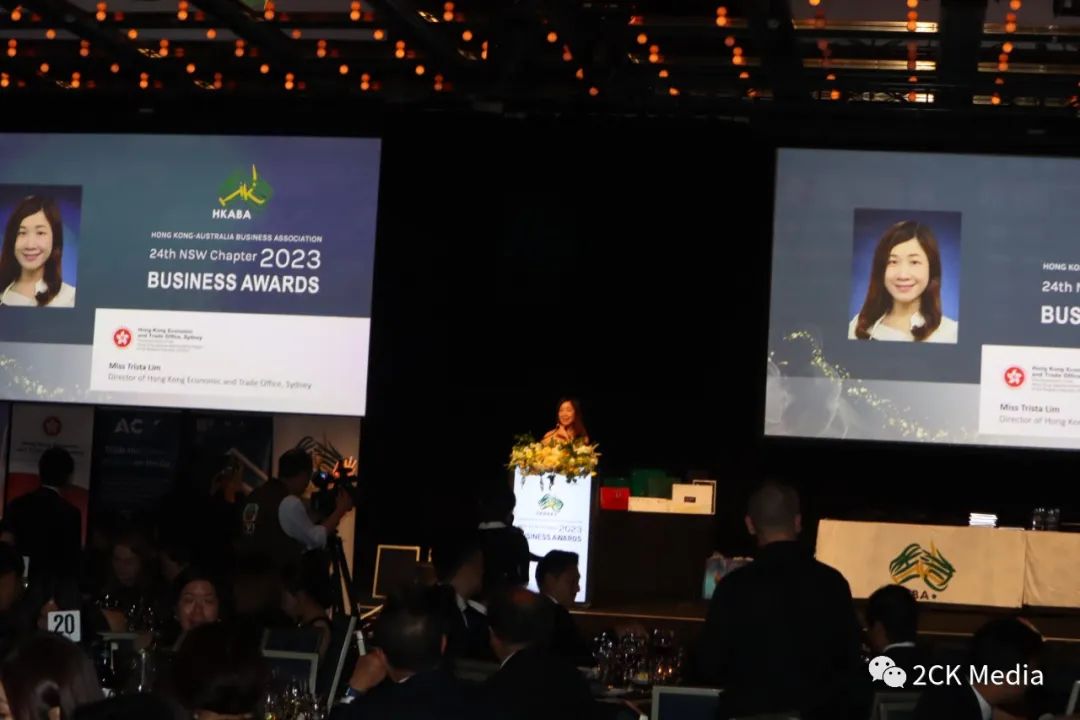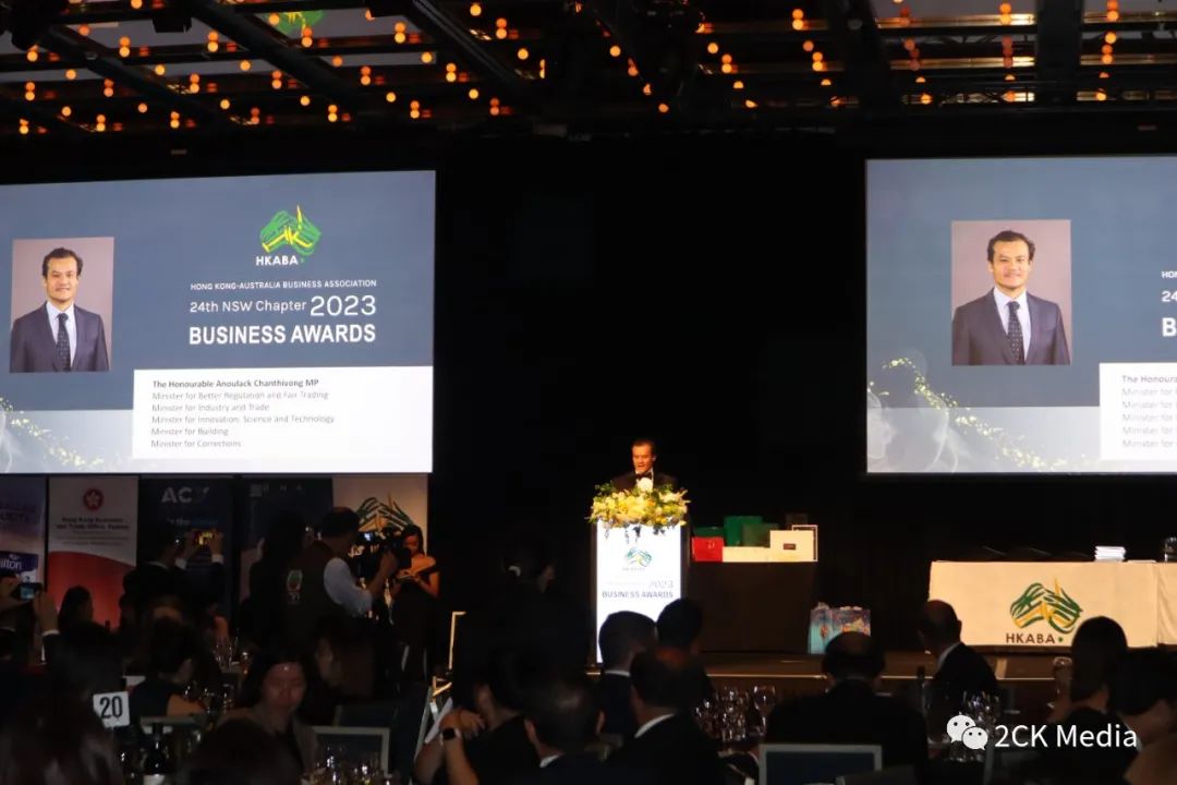 旨在表彰澳洲与香港特别行政区和或中国大陆之间国际贸易各方面表现出色企业的2023 年第 24 届香港澳洲商会(HKABA)新州分会商业成就奖颁奖典礼暨晚宴10月13日在悉尼Sofitel Sydney 举行。香港驻悉尼经济贸易办事处处长林美仪、中国驻悉尼总领馆副总领事于杰、新州州长代表、新州工业与贸易及公平交易厅厅长Anoulack Chanthivong、新州反对党领袖代表Mark Coure议员、 香港澳洲商会新州分会会长Sheldon Mak、2023 年商业成就奖活动主席 Felicia Hon等致词。