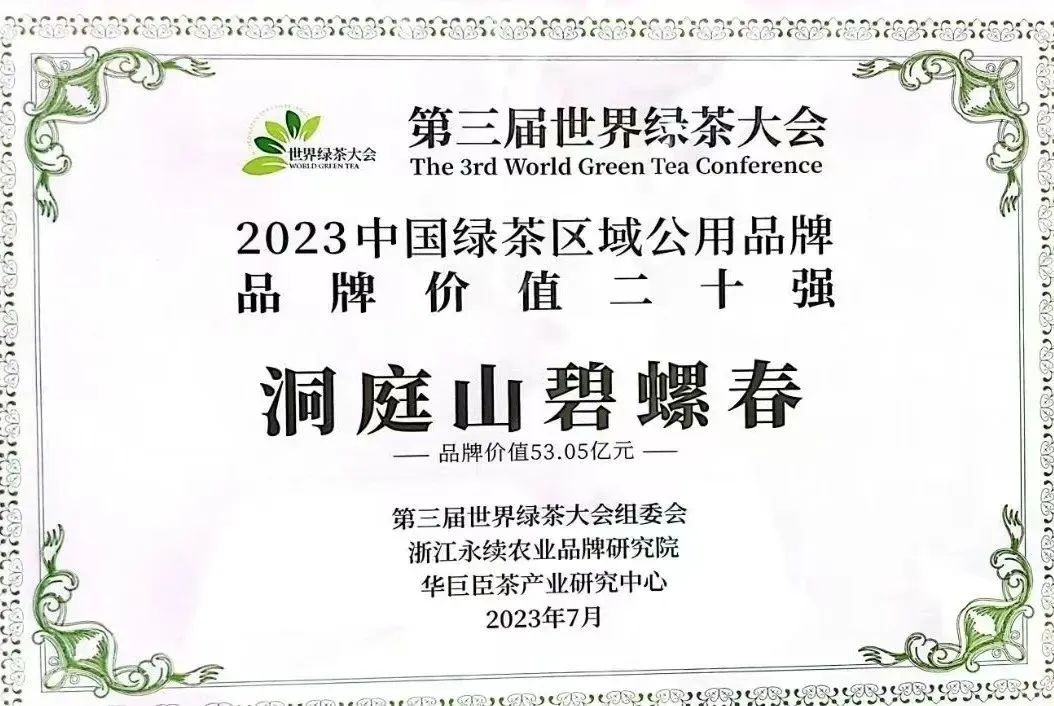 洞庭山碧螺春以53.05亿元稳居中国茶叶区域公用品牌价值第六、中国绿茶区域公用品牌价值第四、中国名茶品牌传播力指数第五,并成功上榜“水韵江苏”非遗精品旅游路线。
