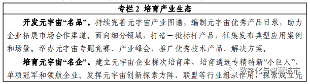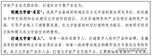 (3)构筑协同发展产业生态。着力培育元宇宙龙头企业和专精特新中小企业,打造产业创新联合体,构建大中小企业融通发展、产业链上下游协同创新的生态体系。鼓励地方结合产业基础,建设一批元宇宙创新应用先导区、科技园区、产业园,构建特色化的元宇宙产业集群。支持建立元宇宙开源社区,鼓励用户积极参与元宇宙技术创新和内容生产,建立健全数字内容流通新机制、新模式、新业态。
