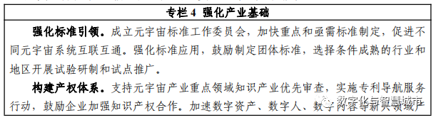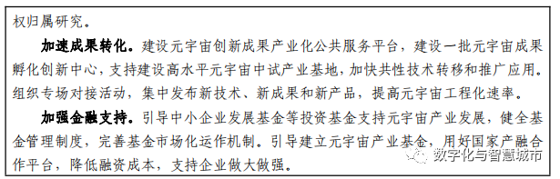 (11)提升创新支撑能力。支持建设元宇宙重点实验室、制造业创新中心、内容制作基地等载体,加强基础技术研究,加快共性技术突破。打造元宇宙中试平台,强化新技术产品测试验证能力,加速优秀成果产业化落地。构建元宇宙产品评估评测体系,提升元宇宙产品和服务质量。健全元宇宙知识产权保护体系,提供高质量、专业化知识产权服务。引导金融资本支持元宇宙发展,推动减税降费政策向元宇宙相关产业倾斜,营造健康可持续的产融合作环境。