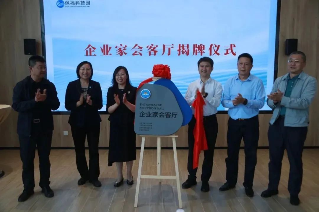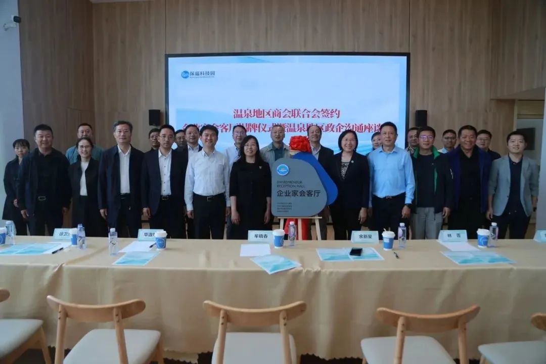 区委常委、统战部部长牟晓春,区委统战部副部长、区工商联党组书记毕淑琴,温泉镇党委副书记、镇长余新星,翠湖科技园商会会长林菁,温泉镇商会会长李呈山,保福科技园商会秘书长毕胜共同为“企业家会客厅”揭牌。