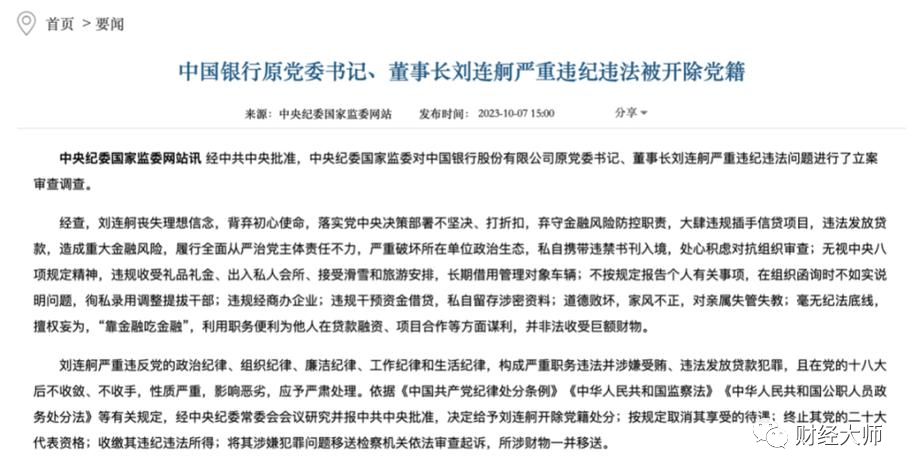 2023年以来,已有7位银行高管被查,其中包括中国银行原党委书记、董事长刘连舸;工商银行上海分行原行长顾国明;建设银行深圳分行原行长王业等。