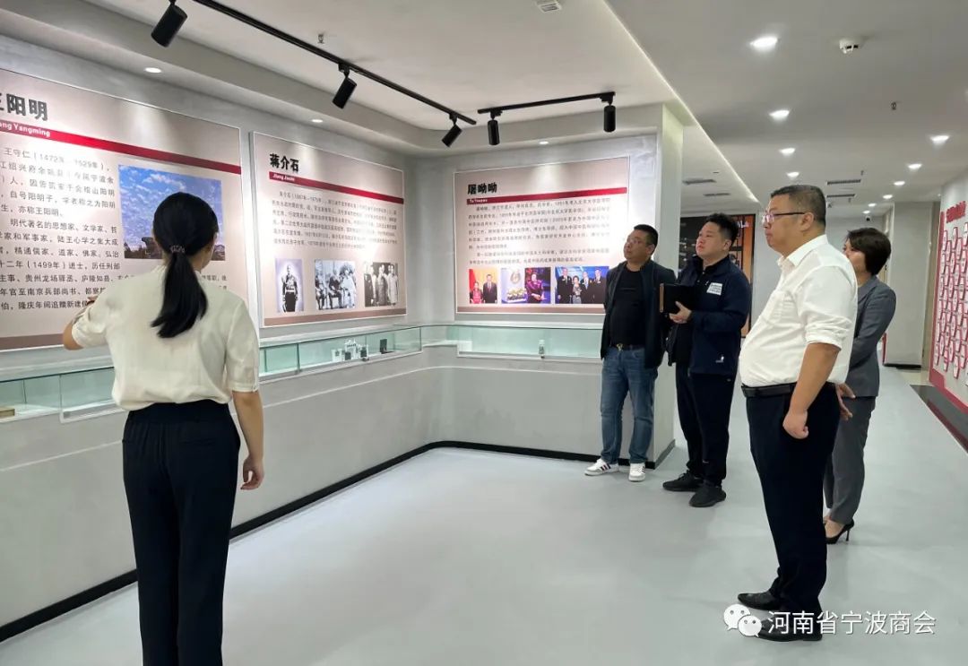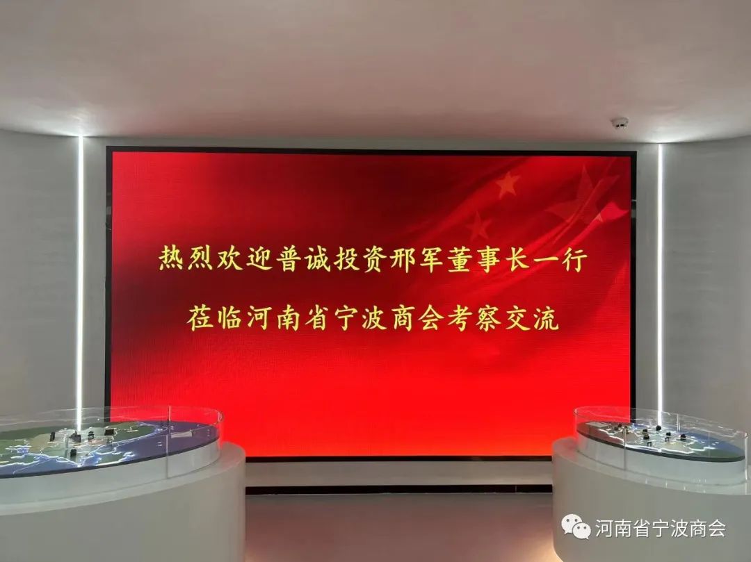商会会长干益飞对江苏普诚投资董事长邢军一行的到来表示热烈欢迎,陪同参观河南省宁波商会展览厅,介绍宁波帮发展历程及商会办公环境,随后前往会长办公室开展座谈。