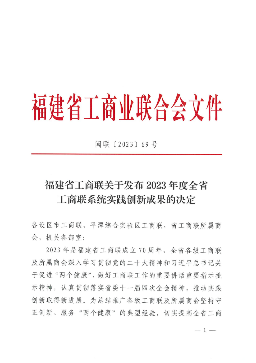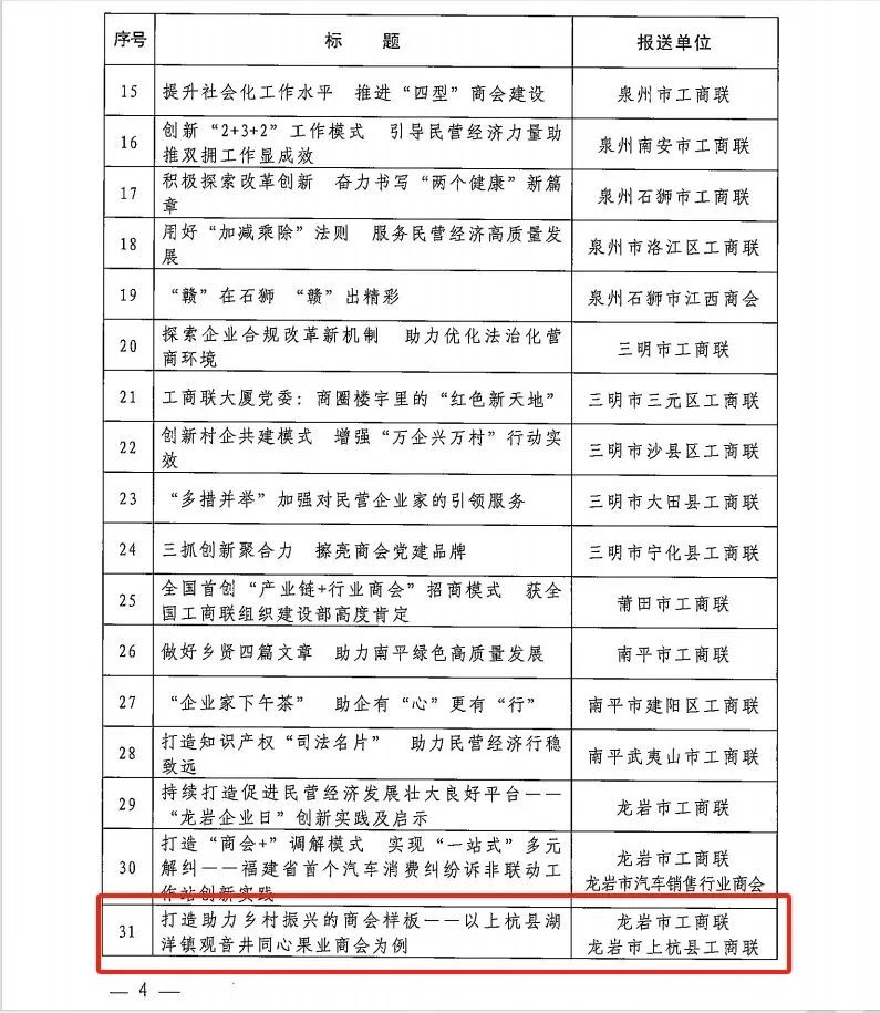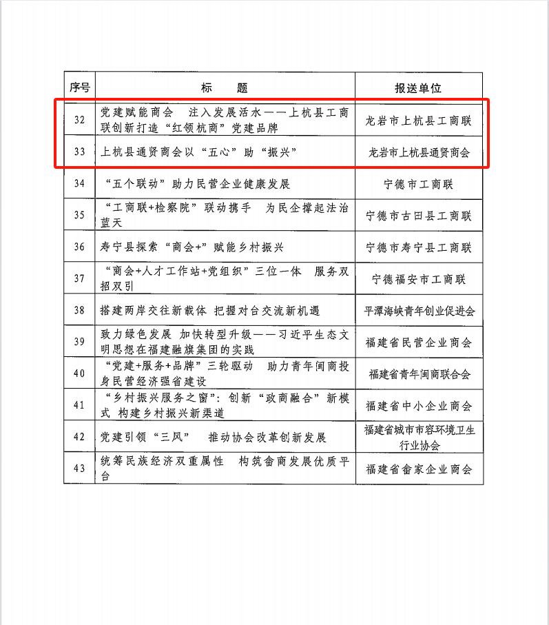 近日,福建省工商业联合会印发《关于发布2023年度全省工商联系统实践创新成果的决定》(闽联[2023]69号),授予43个项目实践创新奖。我会报送的《上杭县通贤商会以“五心”助“振兴”》项目上榜。通贤商会成为2023年度福建省工商联系统获奖单位中唯一的镇级商会,也是我会自成立以来第一次荣获省级荣誉!