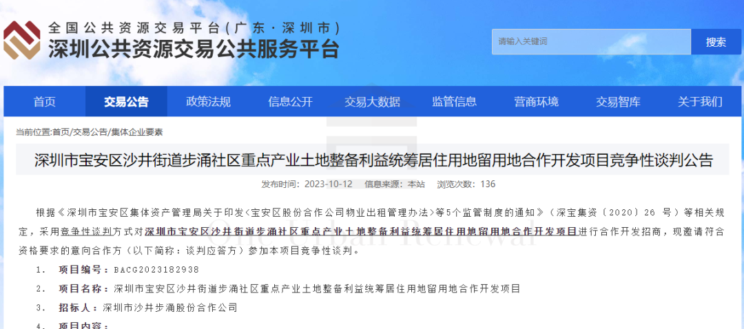 根据《深圳市宝安区集体资产管理局关于印发<宝安区股份合作公司物业出租管理办法>等5个监管制度的通知》(深宝集资〔2020〕26 号)等相关规定,采用竞争性谈判方式对深圳市宝安区沙井街道步涌社区重点产业土地整备利益统筹居住用地留用地合作开发项目进行合作开发招商,现邀请符合资格要求的意向合作方(以下简称:谈判应答方)参加本项目竞争性谈判。