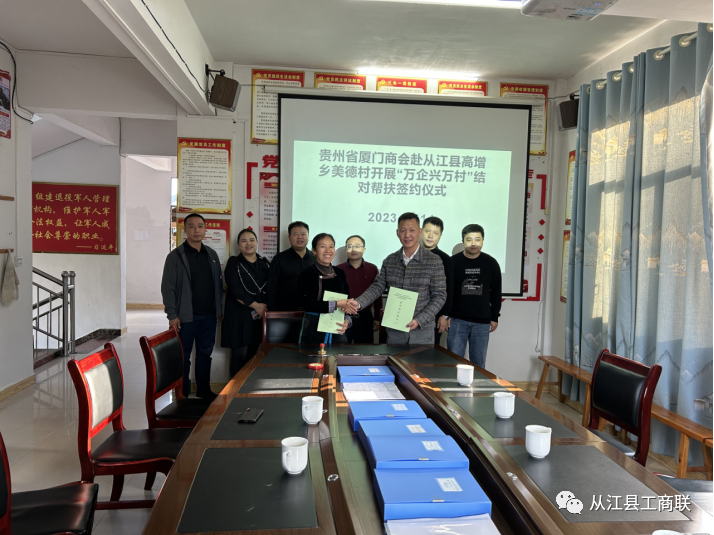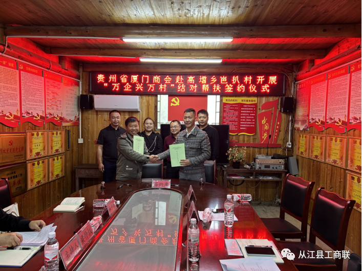在高增乡岜扒村召开了“万企兴万村”结对帮扶座谈会,高增乡政府,岜扒村、美德村两委介绍了乡、村基本情况,贵州省厦门商会介绍了商会情况和商会企业发展现状,双方就如何推动乡村振兴、村企共建、帮扶协作等工作进行了交流并达成初步共识。省厦门商会表示,将充分发挥自身优势,通过产业协作、就业帮扶、消费帮扶等方式推进“万企兴万村”行动,助力乡村振兴。会上,贵州省厦门商会与高增乡岜扒村、美德村签订了结对帮扶协议。