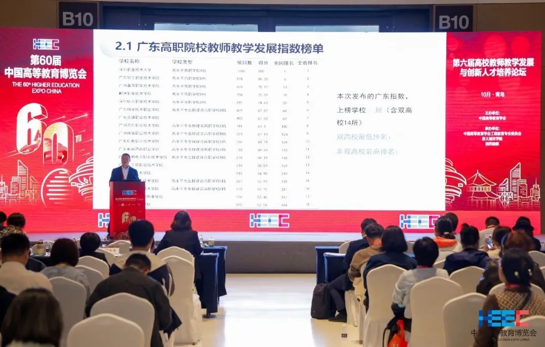 在本届高博会“高校教师教学发展与创新人才培养论坛”上,由中国高等教育学会联合发布了《全国普通高校教师教学发展指数》,广东工业大学联合发布了《广东省本科院校教师教学发展指数》,我校联合发布了《广东省高职院校教师教学发展指数》。副校长曾文权受邀参加了本次论坛并作“2023年广东省高职教师教学发展指数研究与实践”主题报告。