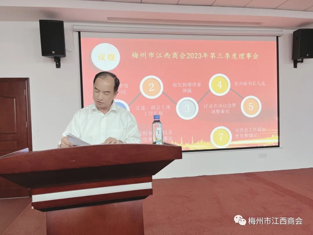 按照会议议程,由谢秘书长就第三季度工作做总结报告,本季度轮值小组积极履行工作职责,重点开展了:横向交流、学习培训、专题活动等会务。例如分别与广东省江西崇义商会、河源江西商会、梅州市零商业行业协会开展交流座谈会;参加“梅州市民营经济论坛·重做”、省工商联平台培训、“强化风险防范、依法护企促发展”、“坚定信心决心,推动苏区融湾”的学习;大埔分会举办医师节、教师座谈会”、兴宁分会举办成立十三周年庆典、参加梅州市知识产权金融创新业务对接等主题活动。