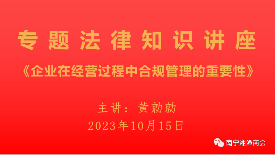 10月15日,南宁湘潭商会召集在邕理事会成员共33人,在商会会议室,举办《企业在经营过程中合规管理的重要性》专题法律知识讲座。商会理事、法律顾问,专业律师黄勍勍担纲主讲。