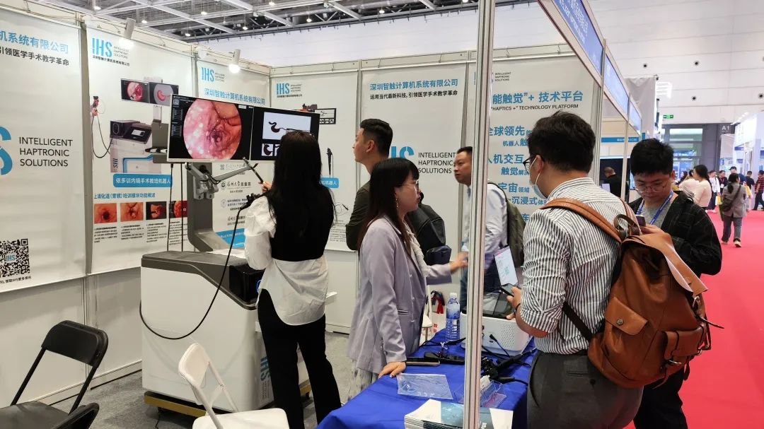 本次展会,IHS智触展出了两款具有里程碑意义的产品,分别是“依多训内镜手术教培机器人(导航版)”和“依多训消化内镜手术教培机器人(便携版)”,展示了IHS智触将智能触觉技术应用在模拟医学领域的产品,并实现商业化销售。