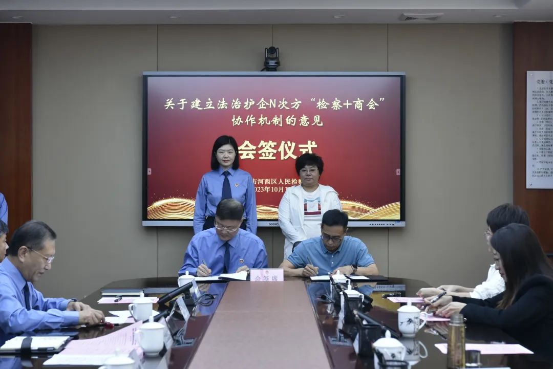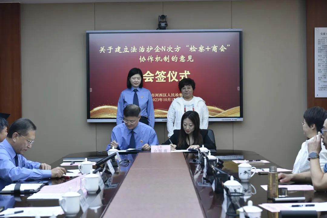 随后,河西区检察院与市文化传媒商会、市新媒体协会和市河北衡水商会分别签署了《关于建立法治护企N次方‘检察+商会’协作机制的意见》。《意见》从优化营商环境、企业家权益保护、企业合规、防范化解金融风险、知识产权保护、公益诉讼等方面,就协同保障民营经济发展提出具体举措,引领企业提升法治化经营和风险防范能力,保障企业依法经营、健康发展。