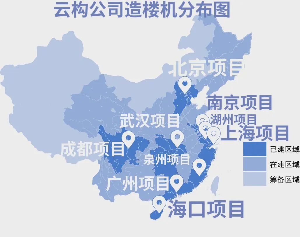 由中建三局自主研发的空中造楼机、轻型造楼机、住宅造楼机经过多年来的迭代更新,现已具备产业推广规模。2022年11月,云构公司应运而生,承担局“造楼机”业务产业化推广与应用使命,积极推进智能建造与建筑工业化协同发展,加快建造方式变革。云构公司立足湖北服务全国,重点布局珠三角、长三角,已累计在12个项目推广应用造楼机21台,实现从摩天大楼到普通高层住宅建筑类型的全覆盖。