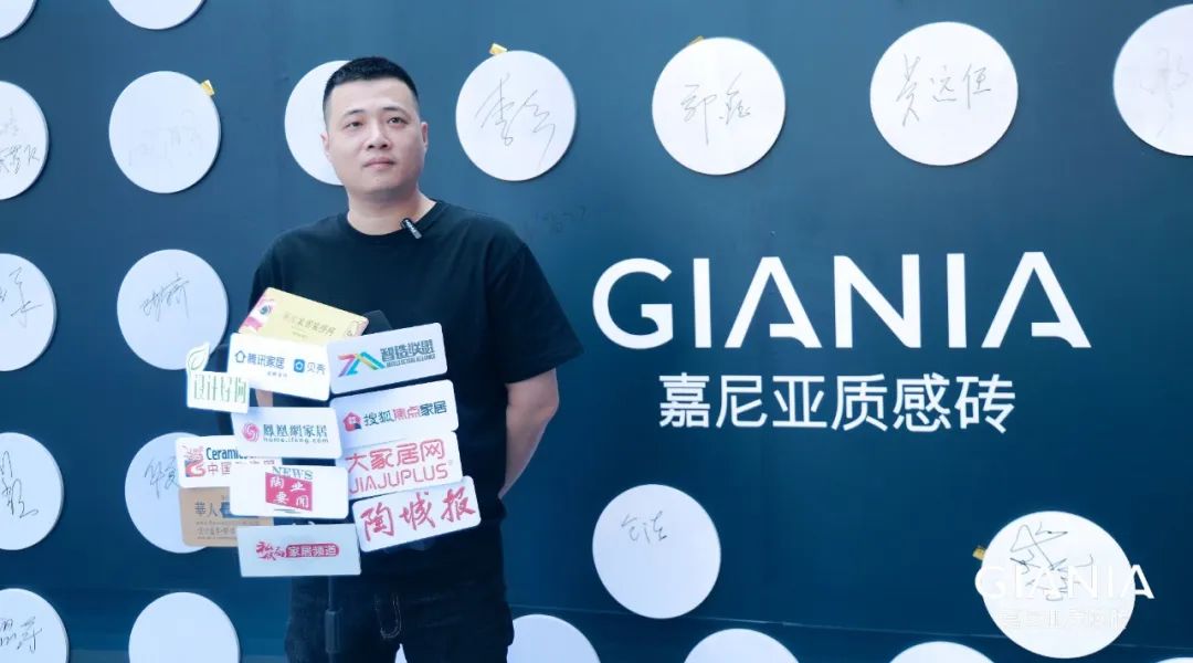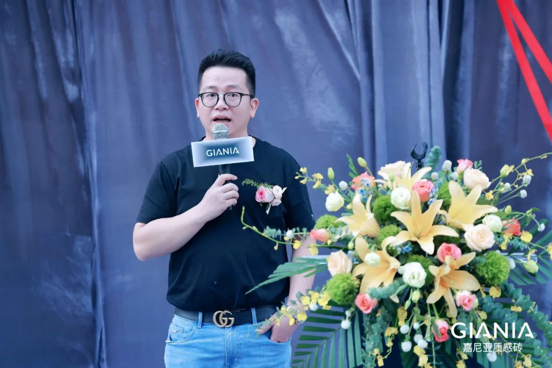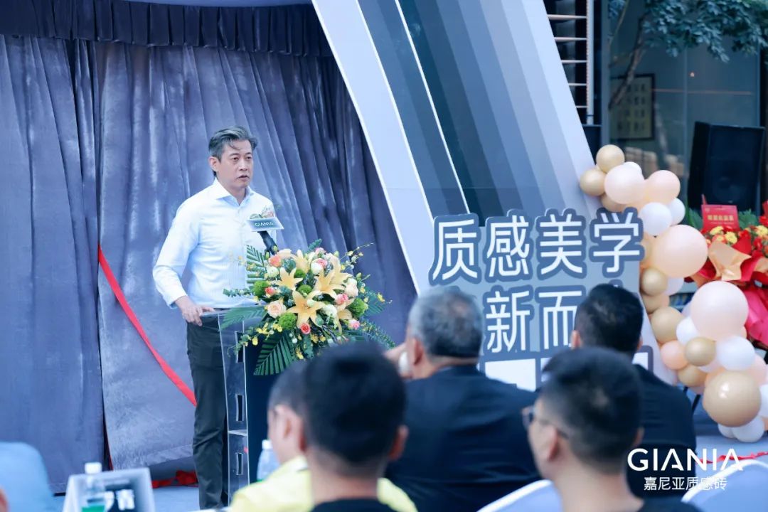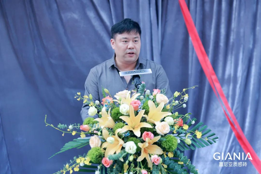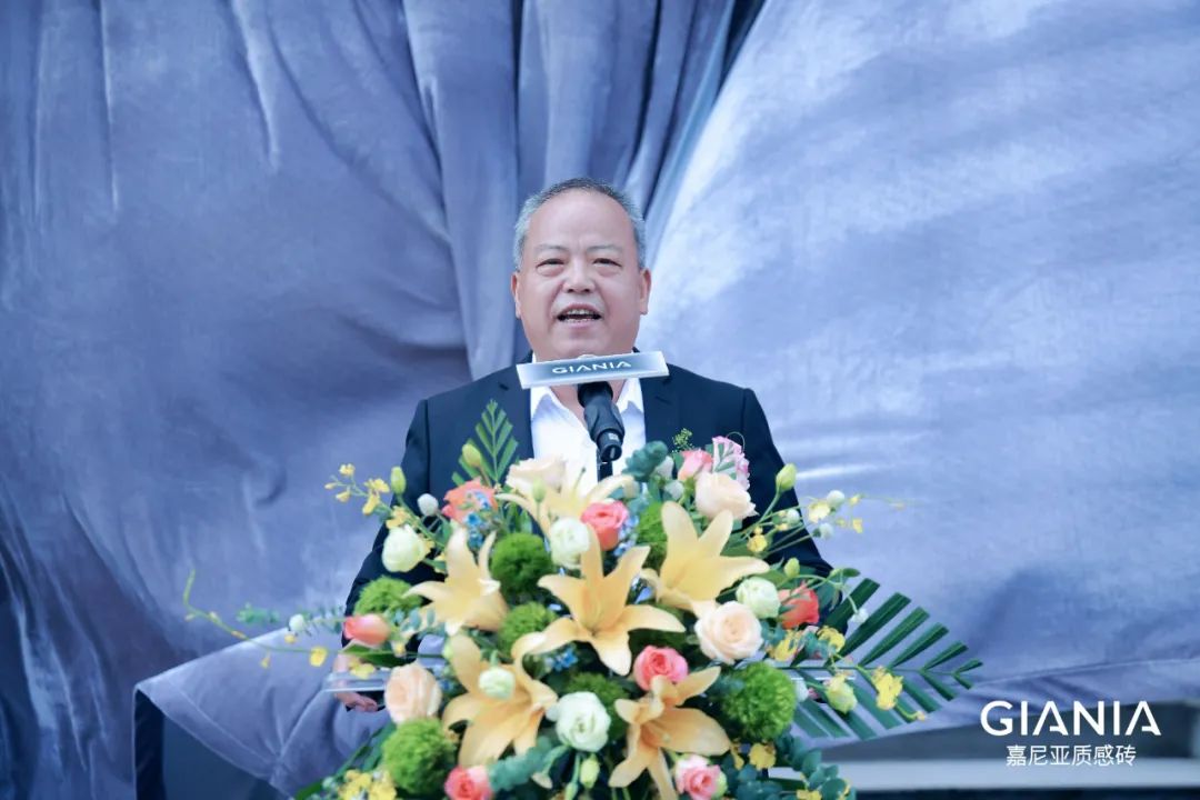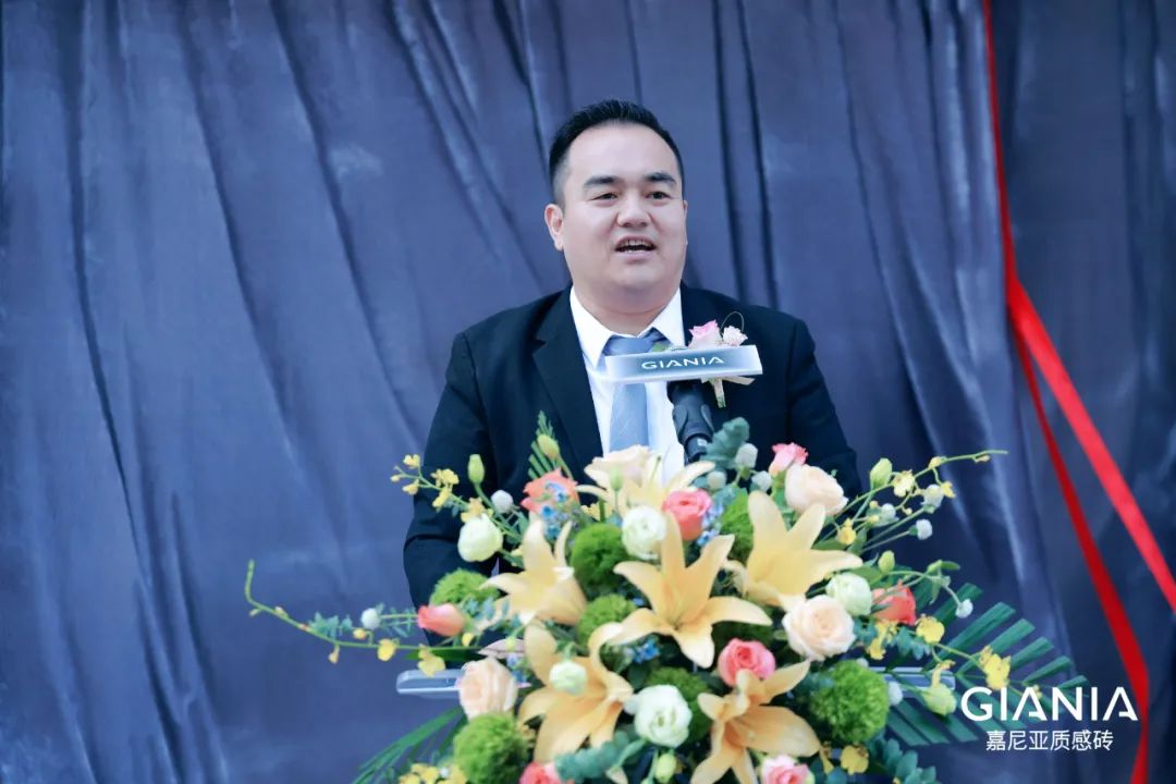 庆典正式启动,主持人介绍活动背景及出席领导。佛山市兴国商会执行会长、嘉尼亚质感砖创始人吕思安先生致欢迎词、讲述公司发展方向、经营业务等。