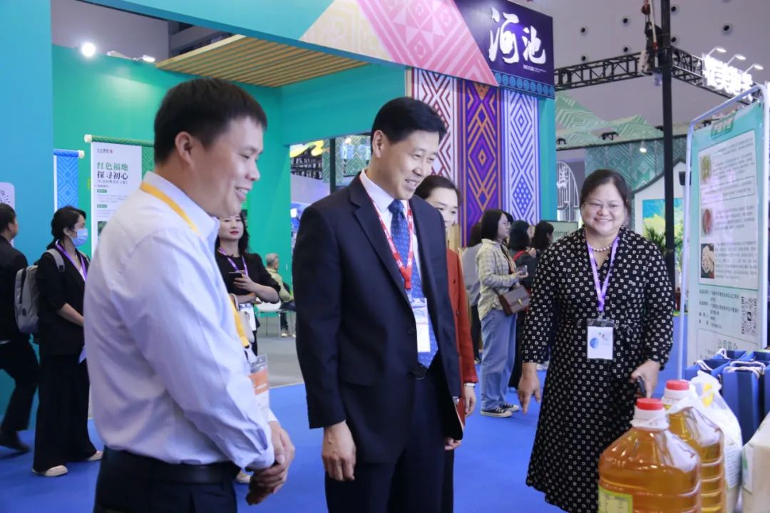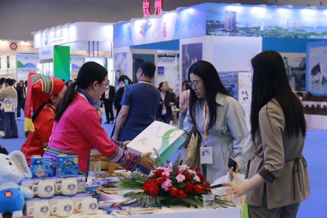 活动期间,会展内,来宾特色展区热闹非凡,各类旅游产品琳琅满目,载歌载舞,用热情的歌舞欢迎四方的客人,尽现“天下来宾 来者上宾”的魅力。游客们在来宾展区各县产品展示区驻足,购买来宾各地特产、非遗文创,咨询旅游信息,品尝来宾市特色美食,如象州茶蓉、塘头藕糖、烤红薯干、古榕酸,金秀野生红茶等。