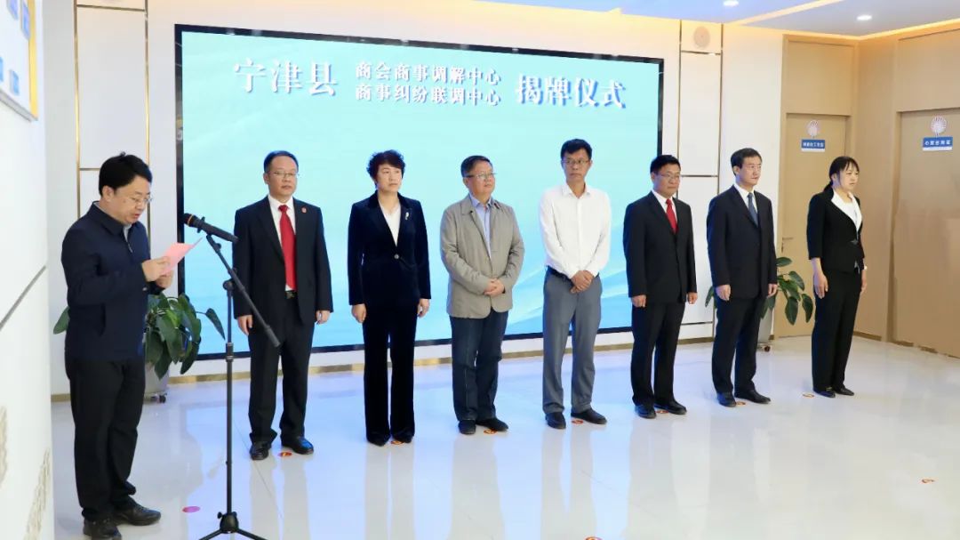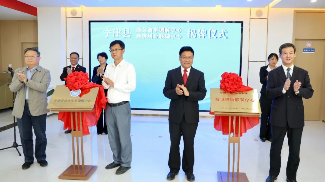 10月17日,宁津县商会商事调解中心、商事纠纷联调中心在津城街道津东党群服务中心揭牌成立。山东省工商联法律服务中心主任杨青山,德州市中级人民法院党组书记、代院长韩成锋,德州市政协副主席、工商联主席康志民,宁津县委书记高善玉共同为基地揭牌并讲话。宁津县委副书记张健捷主持揭牌仪式。宁津县委常委、政法委书记刘凤霞,宁津县委常委、统战部部长、宣传部部长于妍,宁津县人民法院党组书记、院长任运通参加活动。