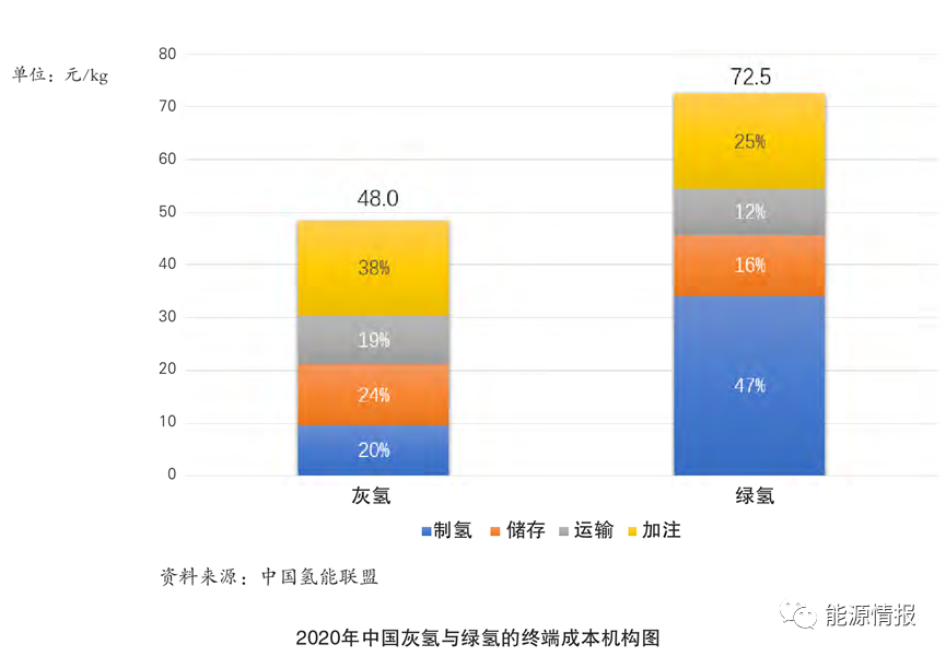除上游生产环节,中游的运输、储存、加注环节也是氢能产业链整体发展的重要环节,加储运环节是目前限制终端氢气平价应用的另一重要因素。以2020年中国灰氢和绿氢的终端成本为例,成本结构如下图所示。