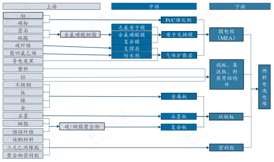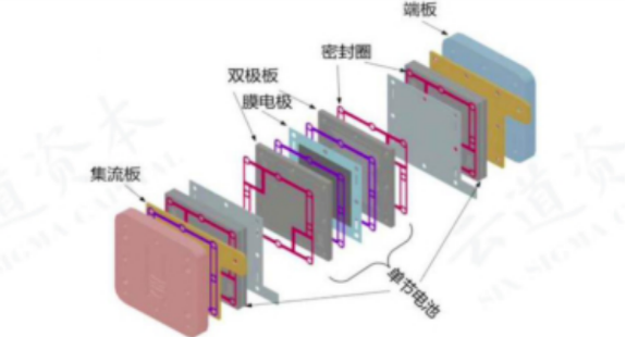 燃料电池系统主要包括电堆、氢气供给系统、空气供给系统、水热管理系统、控制系统等。电堆是燃料电池系统的核心部件,由双极板与膜电极交替叠合后以单电池串联方式层叠组合,各单体之间嵌入密封件,经前、后端板压紧后用螺杆拴牢构成的复合组件,其研发和生产具备较高的技术壁垒。