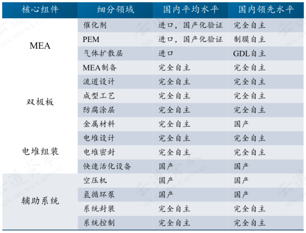 燃料电池系统的国产化进程自19年以来步入快车道,现阶段我国在MEA制备、双极板、电堆组装、辅助系统等领域已实现了100%自主化,是近两年燃料电池系统降本的关键推动力。