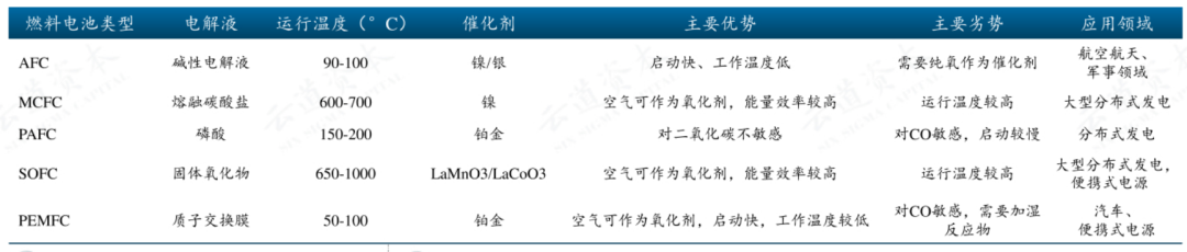 根据电解质和燃料不同,氢燃料电池可分为AFC、MCFC、PAFC、SOFC、PEMFC等不同类型。