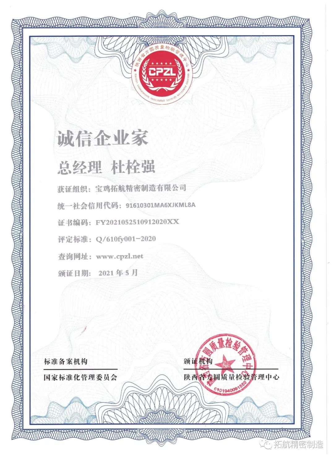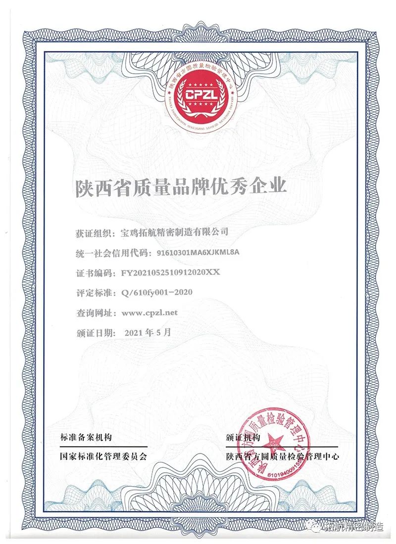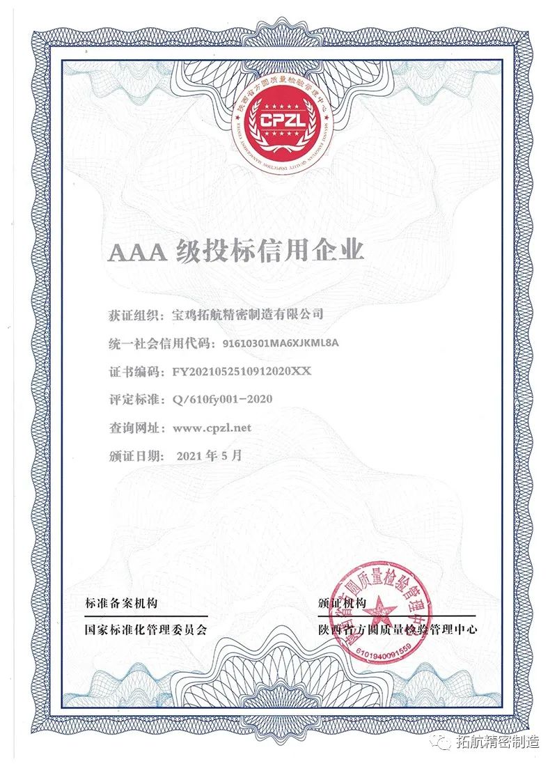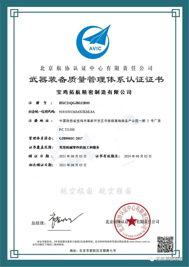 宝鸡拓航精密制造,是一家专业加工各种规格的精密机械零部件企业,主要加工方向包括航空航天动力机械零部件、飞行器零部件、新型钛及钛合金高温材料机加零部件(包括叶轮、叶盘、叶片等产品制作生产),机匣精密制造、五轴联动加工、精密结构件、磨具制造;船舶、制冷、风机等大型叶轮制造生产,涉及金属钛及钛合金、不锈钢、铝合金、高温合金、镍基等。拥有现代化生产厂房2300平方米,各类生产设备30台。先后通过国标GB/TI9001:2016、质量体系ISO9001:2015、宇航AS9100、国军标GJB9001C:2017体系认证,致力成就精密制造标杆,铸百年拓航品牌。