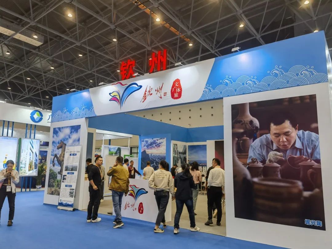 钦州展馆位于6号馆(广西文化旅游展区),展馆以蓝色和白色为主色调,随处可见中华白海豚元素的布置,尽显滨海休闲城市风情,全方位展示钦州“岭南古郡、千年陶都、英雄故里、海豚家园、魅力之城”特点。