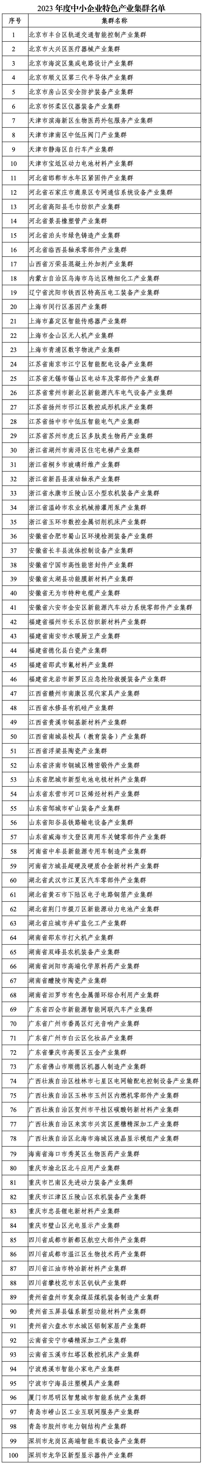 关于公布2023年度中小企业特色产业集群名单的通告