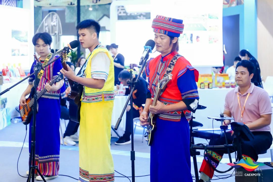 活动期间,会展内,来宾特色展区热闹非凡,各类旅游产品琳琅满目,载歌载舞,用热情的歌舞欢迎四方的客人,尽现“天下来宾 来者上宾”的魅力。游客们在来宾展区各县产品展示区驻足,购买来宾各地特产、非遗文创,咨询旅游信息,品尝来宾市特色美食,如象州茶蓉、塘头藕糖、烤红薯干、古榕酸,金秀野生红茶等。