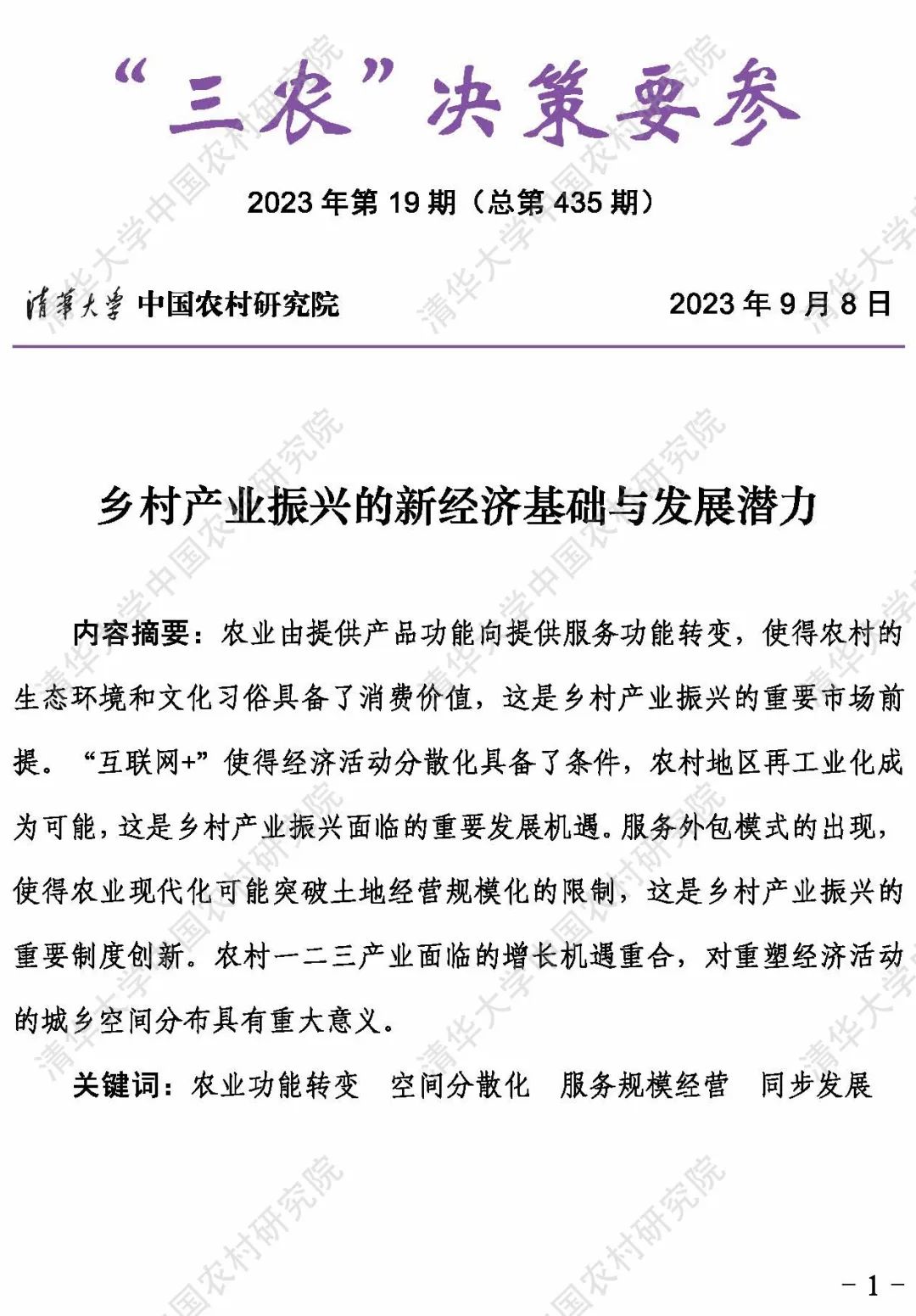 《“三农”决策要参》刊载最新的“三农”研究成果和“三农”动态,服务国家“三农”决策需求,致力于提供准确、及时、科学和高质的政策建议。目前,已编辑发行400余期,多篇报告获重要批示,部分信息被相关部门转载,影响面日益扩大。