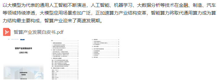 《智算产业发展白皮书(2023年)》由中国电信研究院编制,系统分析了智算产业发展环境、产业链全景特点、最新进展及面临挑战,指出了智算产业五大发展趋势、七大技术关键词,提出了我国智算发展潜力评估体系及分省指标结果,并介绍了典型智算中心建设场景案例。