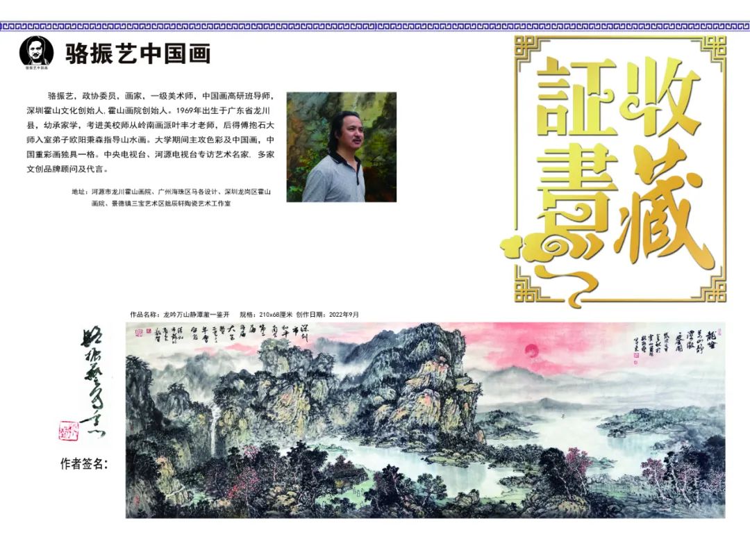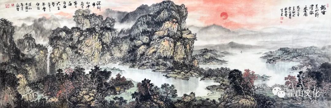 这幅山水国画,是根据中国名画《富春山居图》,以及岭南东江两岸富春山居寓意为素材来进行创作的。作品名称为《龙吟万山静,潭澈一鉴开》画面生动形象地描绘了改革开放以来,党和国家给人民带来了美好的生活。此画上承北宋初期山水画家李成和范宽以水墨为主的传统,把表现北方雄浑壮阔的精神溶于南方秀美的山水之中在,画面在凝重恬静之美中又有气势恢宏之美,画中高山耸立,曲水环绕,旭日东升,雅室辉映,山水有情。画中富有的主人正在千亩的豪宅后花园接待亲朋好友。书中云:山为人,水为财,寓意商会的发展,在会长与会员们的共同努力下,一定会越来越好,一定会做强做大。