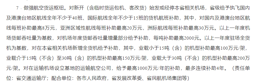 在《若干措施》中,关于做强航空货运枢纽方面提出资金补贴条款: