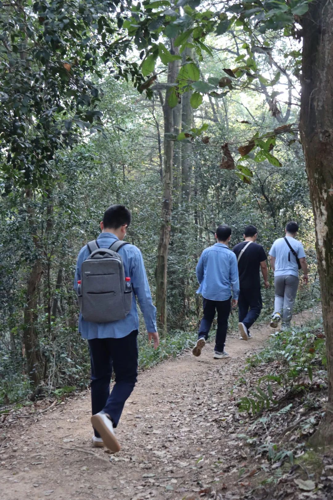 徒步队伍紧随领队,探路而行。路,在山石草丛间,时而逼仄,时而陡峭,时而不辨东西。枯枝落叶掩映其上,稍有萧瑟之意;石上青苔滑腻,稍不留意或可惊心。虽然已挥汗如雨,但仍步伐坚定,一往无前,很快到达了半山腰。体力稍差的成员已略显疲惫,但没有任何退缩的念头。大家互相加油打气,携手共进,并肩前行。