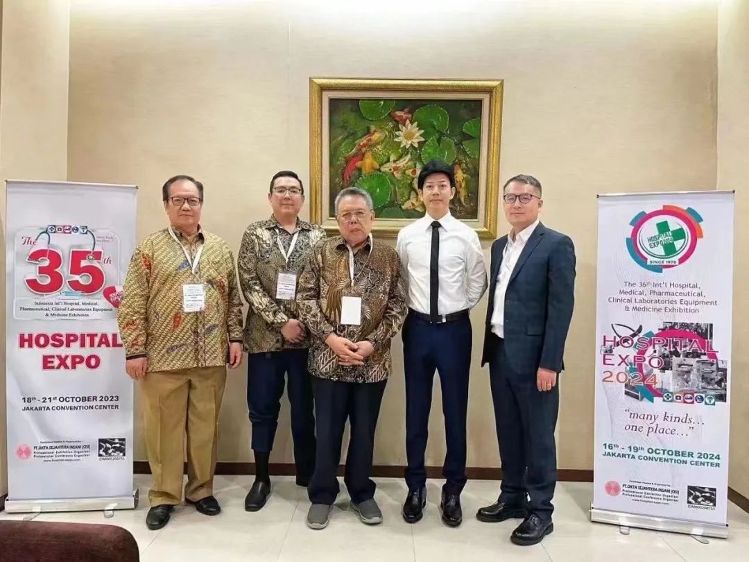 ↑ 巨星思迈全球业务合作伙伴黄栋先生(右起第2位)与展会主办方印尼医院协会会长(右起第3位)合影留念