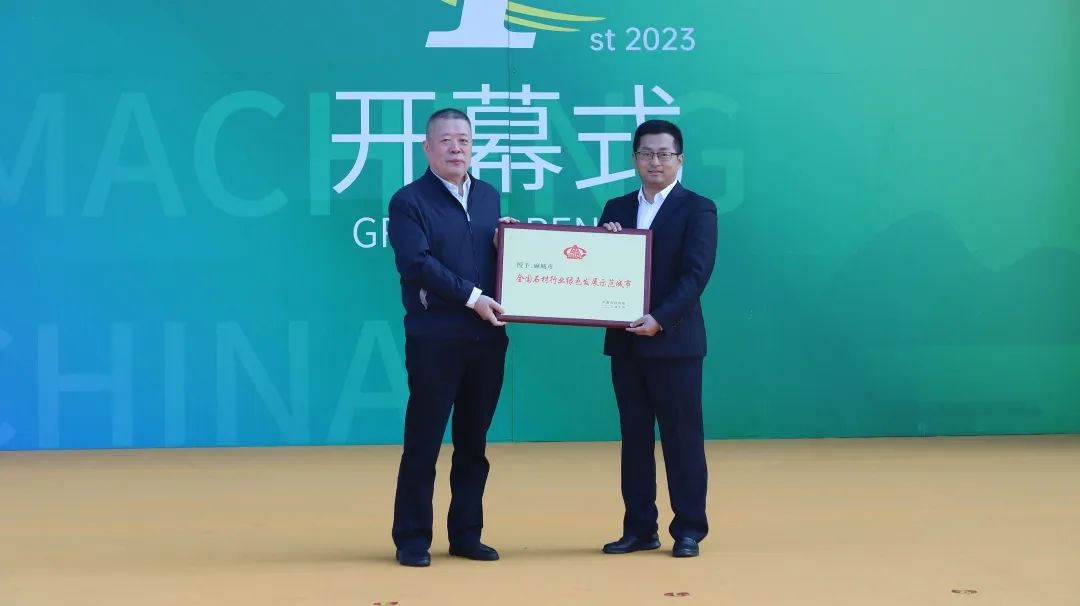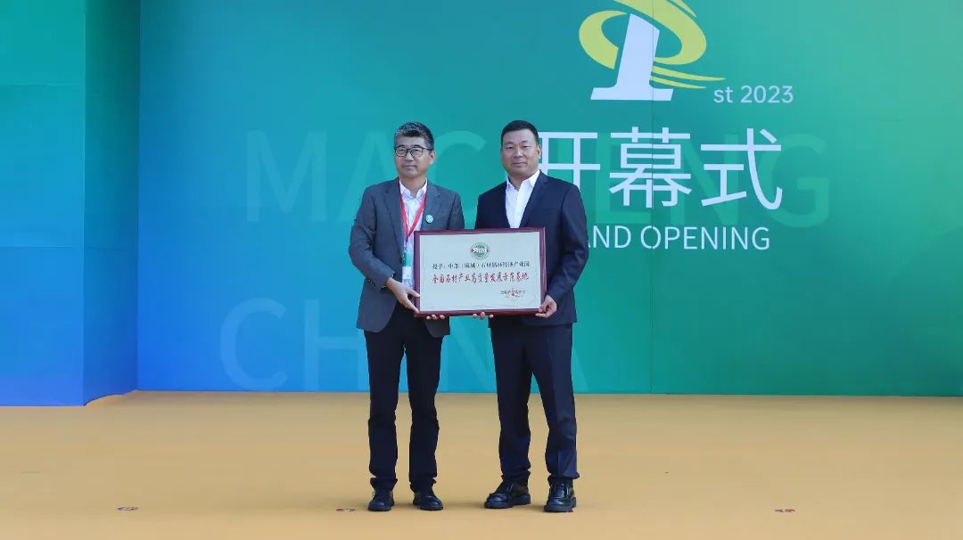 全国工商联石材业商会会长刘良授予中部(麻城)石材循环经济产业园 “全国石材产业高质量发展示范基地”荣誉称号,由园区开发公司董事长李龙才进行接牌。中国中部(麻城)石材循环经济产业园以专业化、生态化、规模化、信息化、国际化为五大目标,立足中部,面向全国,引入国际化先进管理理念,致力于打造潜力无限的世界一流产业园。