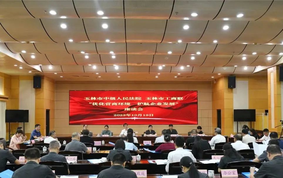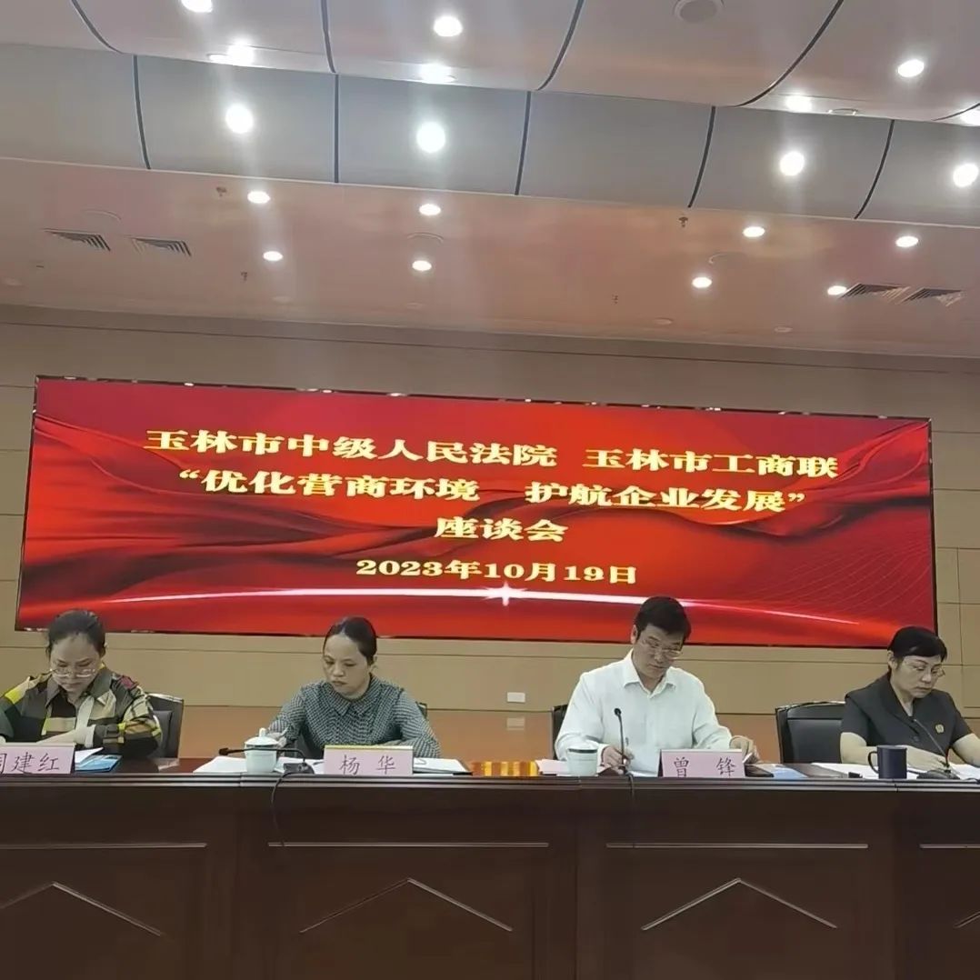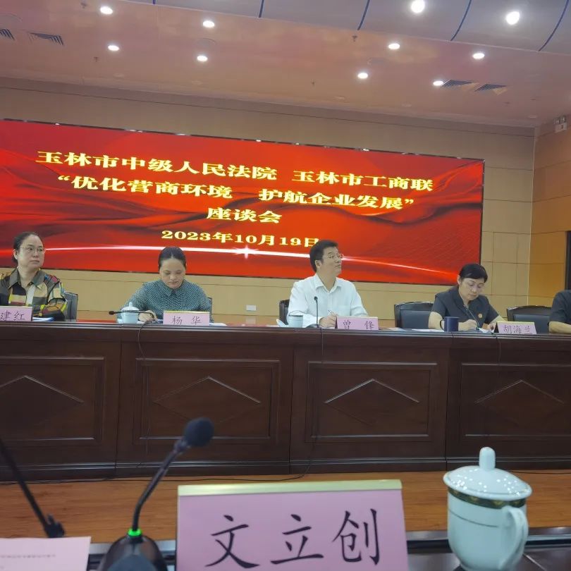 为贯彻落实中央、自治区和市委关于关于优化法治环境、促进民营经济发展壮大的决策部署精神,持续做好优化法治化营商环境工作,以实际行动护航企业高质量发展,10月19日,玉林市中级人民法院与玉林市工商联召开“优化营商环境 护航企业发展”座谈会。玉林市委政法委副书记杨华,市中级人民法院党组书记、院长胡海兰,市政协副主席、市工商联主席曾锋出席座谈会并讲话。市中级人民法院党组成员、副院长梁宁主持座谈会并介绍全市法院服务保障民营经济工作情况。