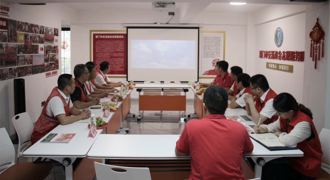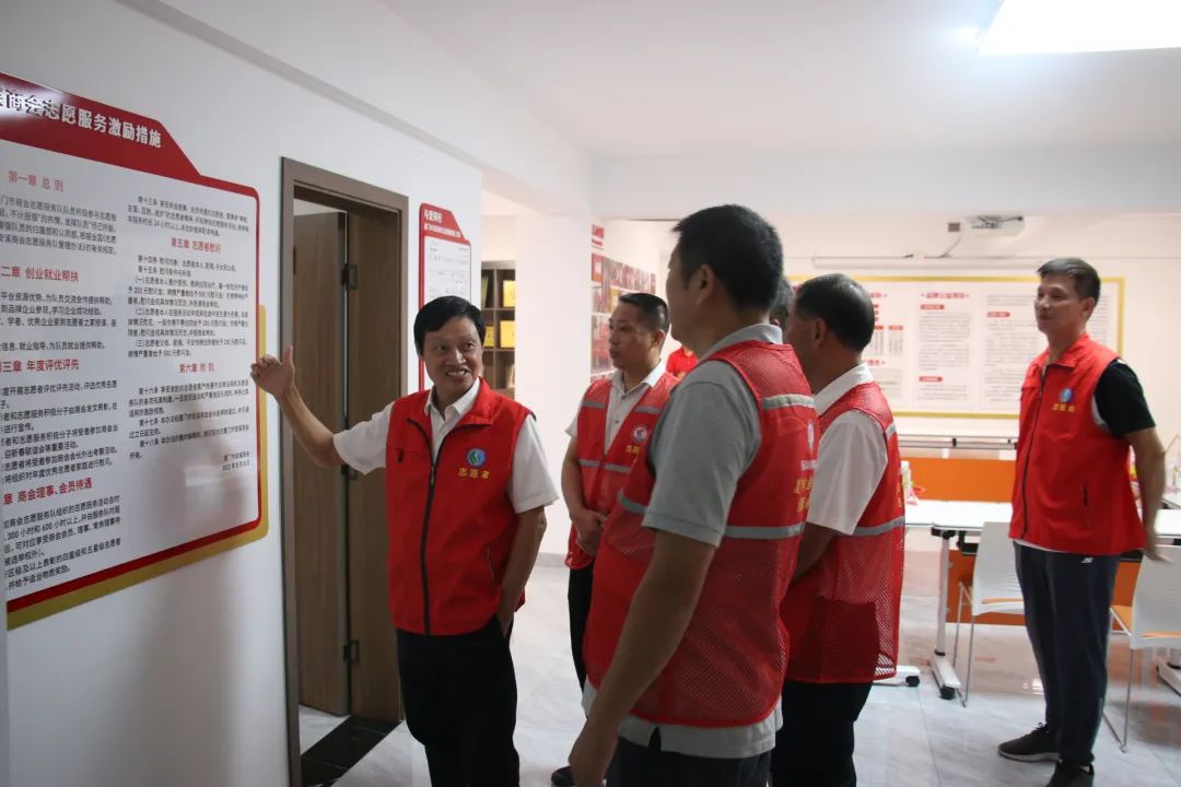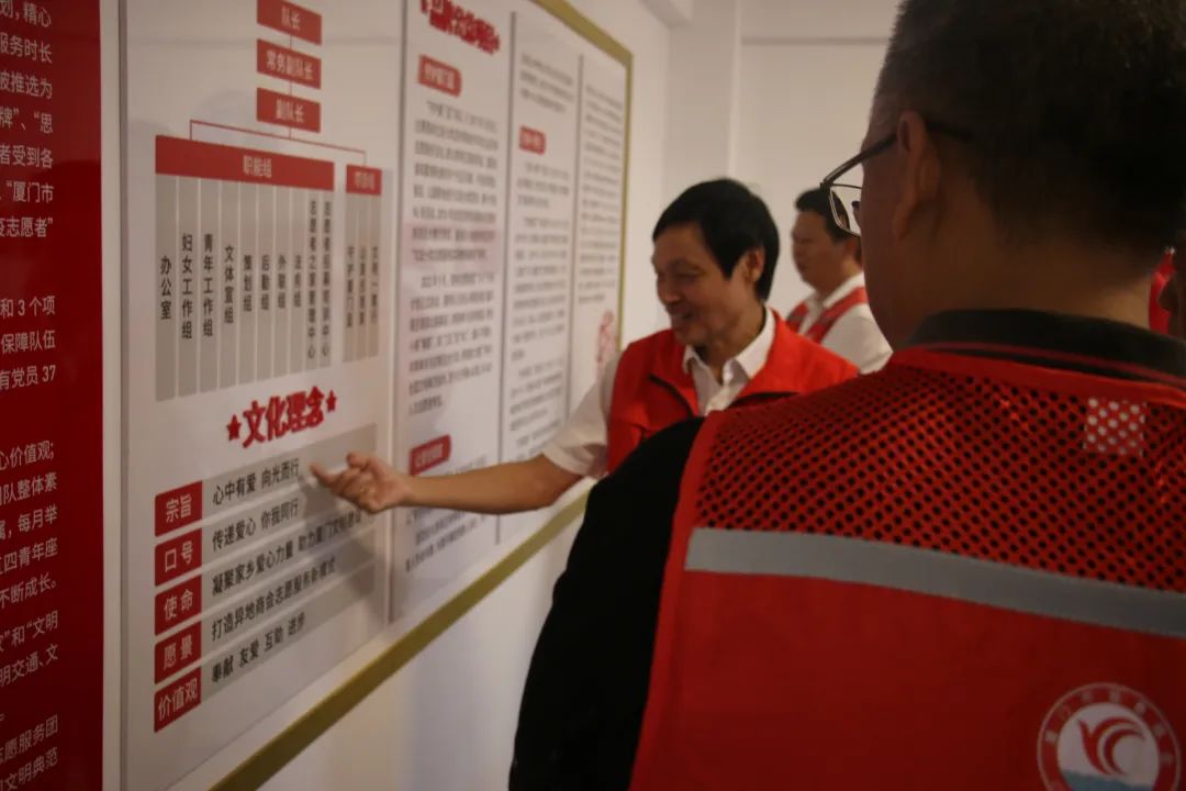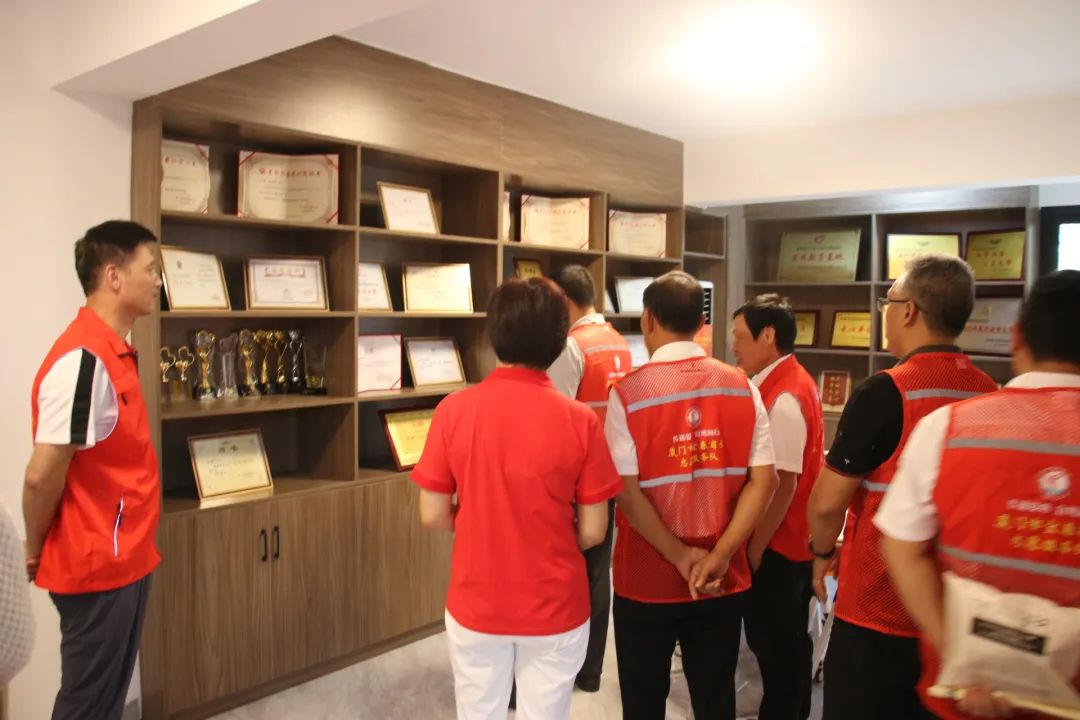 来宾们首先参观了志愿者之家。杨两山队长向他们介绍说,厦门市安溪商会志愿服务队成立于2017年4月,现有注册志愿者680名,其中星级志愿者121名。六年多来,在厦门市委文明办、厦门市志愿者联合会和思明区委文明办的关心指导下,在厦门市安溪商会的高度重视和大力支持下,服务队认真策划,精心组织,开展各类志愿服务活动2000多场、20000人次参与、无偿奉献60000多个志愿服务时长,得到社会各界和广大市民的肯定与赞扬。曾先后获得“厦门市工商联(总商会)公益慈善品牌”、“思明区品牌志愿服务队”、“厦门市最美志愿服务组织”等荣誉;共有99名志愿者受到各类表彰,其中有17名志愿者分别荣获“福建省最美志愿者”、福建省五星级志愿者、“厦门市最美志愿者”、“厦门市四星级志愿者”、“厦门市三星级志愿者”、“思明区最美志愿者”、思明区最美抗疫志愿者”等称号,各项活动和志愿者的感人故事被主流媒体报道198次。在介绍过程中,来宾们对服务队文化墙内容驻足观看,赞不绝口。