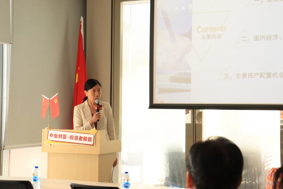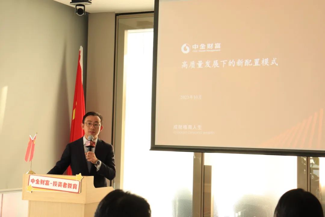 中金财富产品与解决方案部副总经理赵欣围绕《高质量发展下的新配置模式》进行主题讲解。他从当前居民资产配置结构变化开篇,分析了我国居民资产配置呈现金融资产占比上升,不动产占比下降的新趋势。在当前无风险收益率进一步下行、存单利率年内三轮下调的情形下,他建议大家注重投资配置比例问题,在“优化配置”的前提下,做到以收益目标为下限,以风险承受能力为上限,合理配置资产,尽量达到“东边不亮西边亮”布局下的整体盈利目标。
