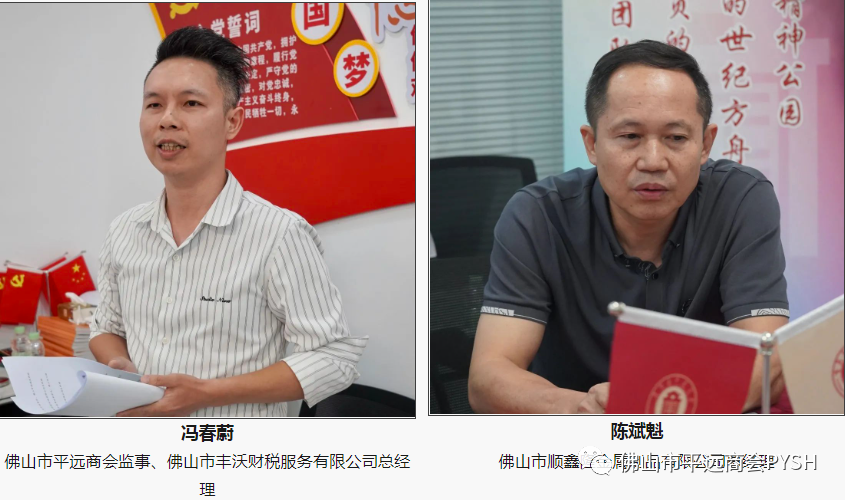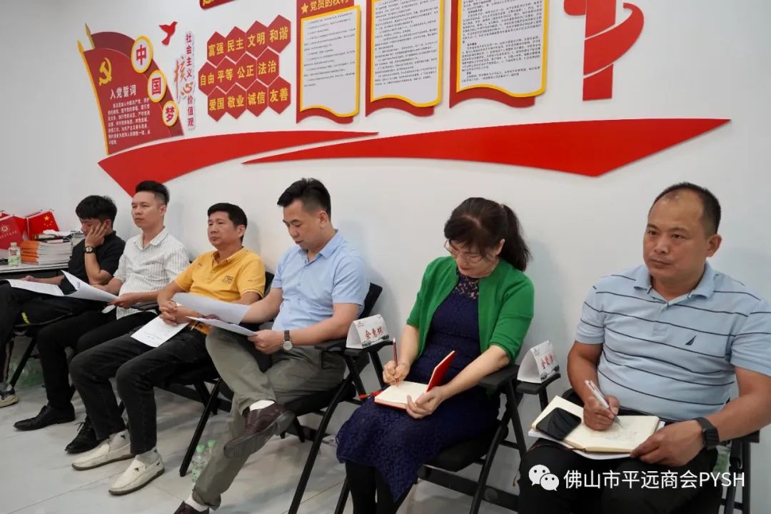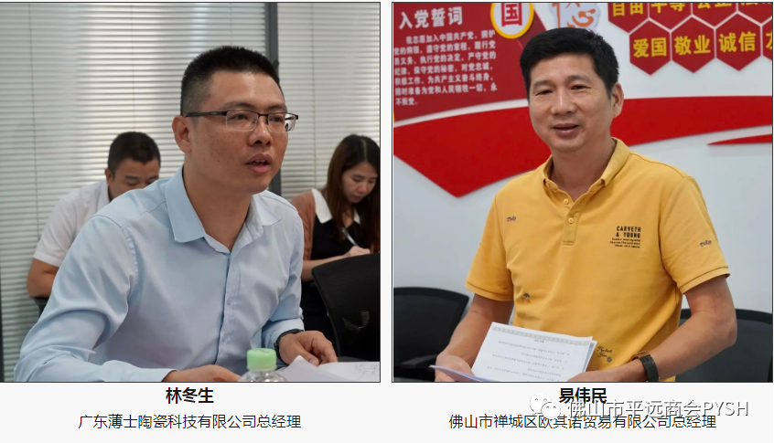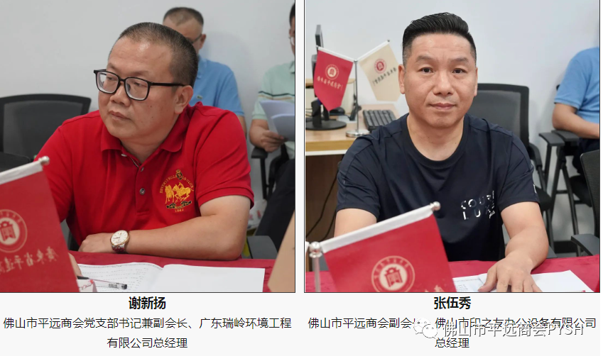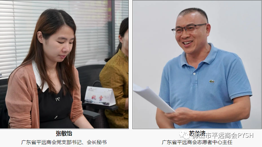 佛山市平远商会党支部书记兼副会长、广东瑞岭环境工程有限公司总经理谢新扬、佛山市平远商会副会长、佛山市印之友办公设备有限公司总经理张伍秀、佛山市平远商会监事、佛山市丰沃财税服务有限公司总经理冯春蔚、佛山市顺鑫隆金属制品有限公司总经理陈斌魁、广东薄士陶瓷科技有限公司总经理林冬生、佛山市禅城区欧其诺贸易有限公司总经理易伟民、珠江富士电梯(中国)有限公司营销经理马智勇等佛山市平远商会会员;佛山市合科包装制品有限公司林秋苑、佛山市信立泰科技有限公司总经理韩丽平等乡贤。