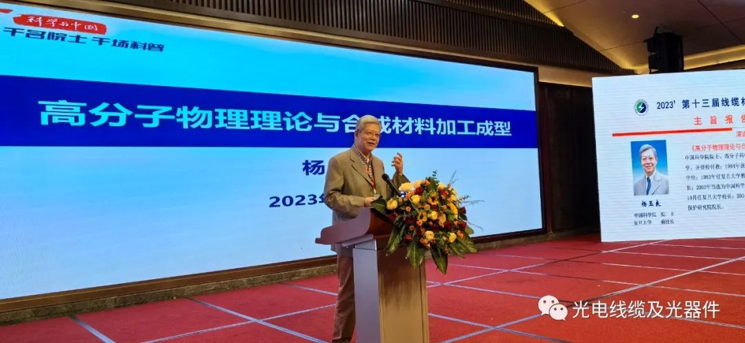 主旨报告上阶段由临安电线电缆行业协会、杭州普天乐电缆有限公司孙建文总经理主持。分别由中科院院士、复旦大学原校长杨玉良院士,中科院院士、东华大学材料科学与工程学院朱美芳院长,作《高分子物理理论与合成材料加工成型》和《先进纤维材料研究进展》的演讲。