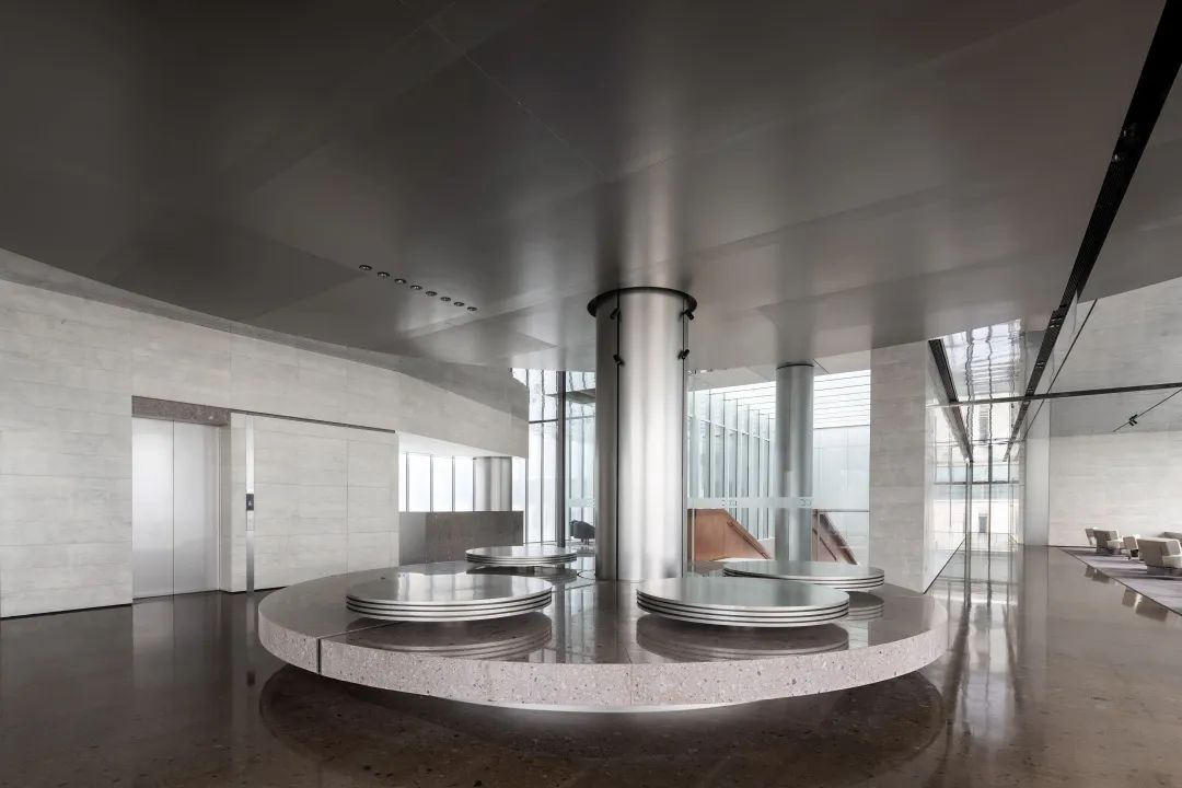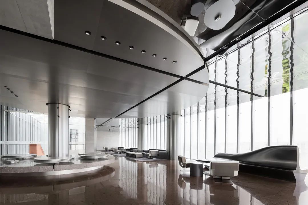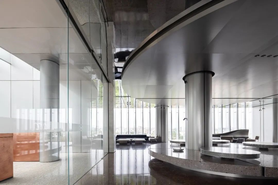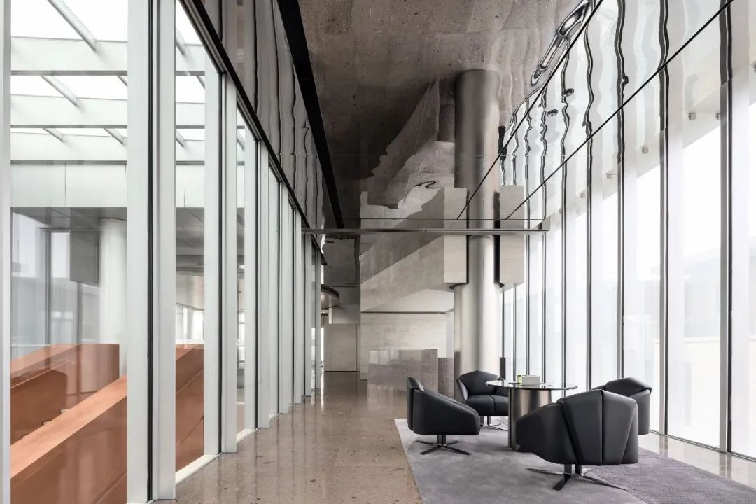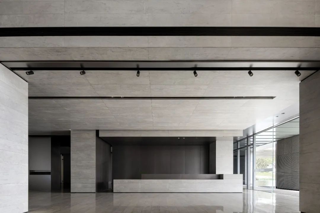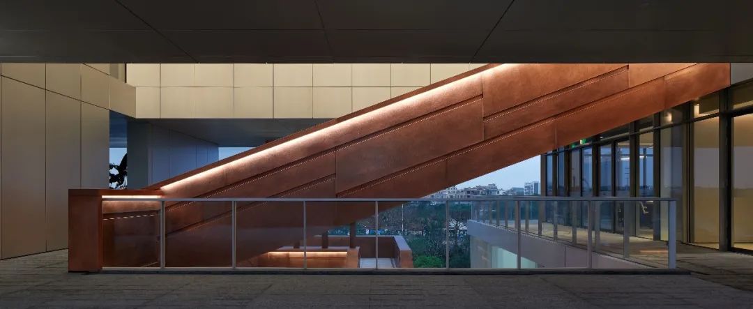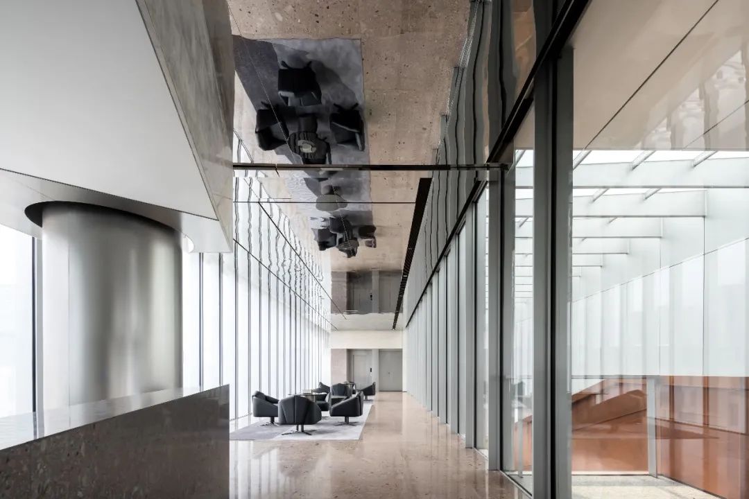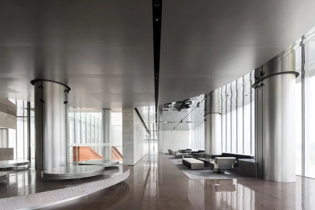 设计师利用柱位增加灯具点位,有效减少顶部需要的灯具点位,从而保证顶面跟纯粹的镜面效果,顶面用了镜面不锈钢材质拉伸视觉层高,并通过蜂窝铝的材质复合让镜面得到尽可能的平整。 回应与共生 建筑设计留存了原始地形的记忆,构建了贴地生长,向自然延展的形态,回应了场地的阳光、微风。室内设计体现于建筑之内,也同样对内外做出了回应:结合主动开放的建筑思路,突出当代工业技术,将高科技工业和技术元素融入设计中加以着重表现;户外楼梯隐约展露于大厅与其它楼层的连接处,塑造视线与动线彼此交互的“戏剧化”场景,消弥了空间的边界感。 “光之于空间,就像声音之于音乐。建筑的体验,重叠的视角——这就相当于光中的空间声学。”通过前期与建筑公司的沟通,室内外的吊顶高度得以延续,We try to minimize the boundaries between the interior and exterior spaces of the building and introduce sunlight, greenery and rich landscaping to create a good public communication space.