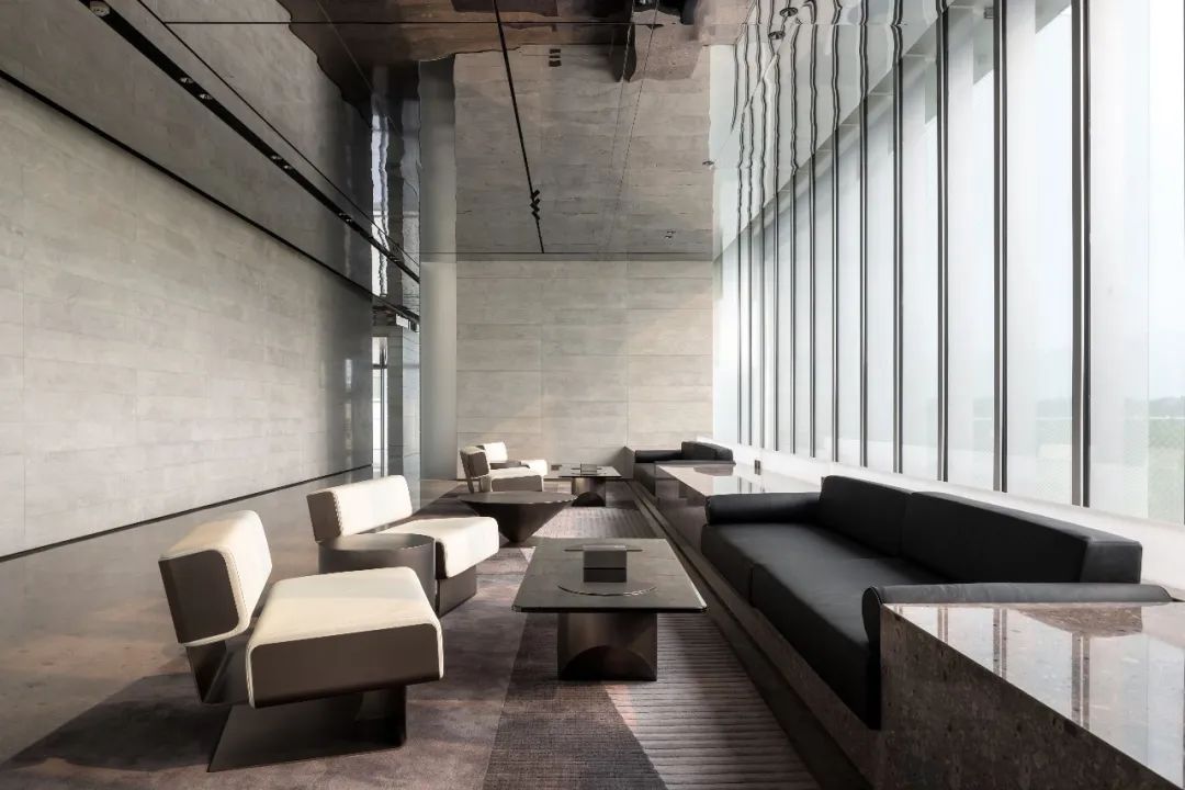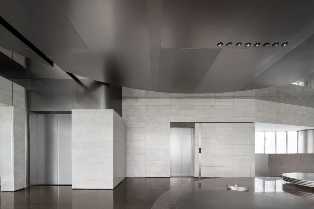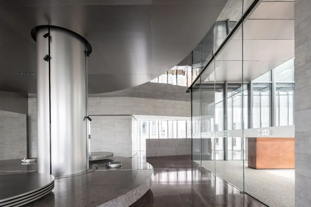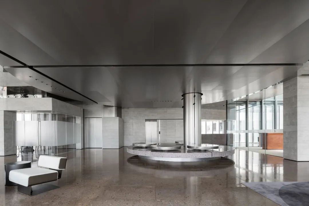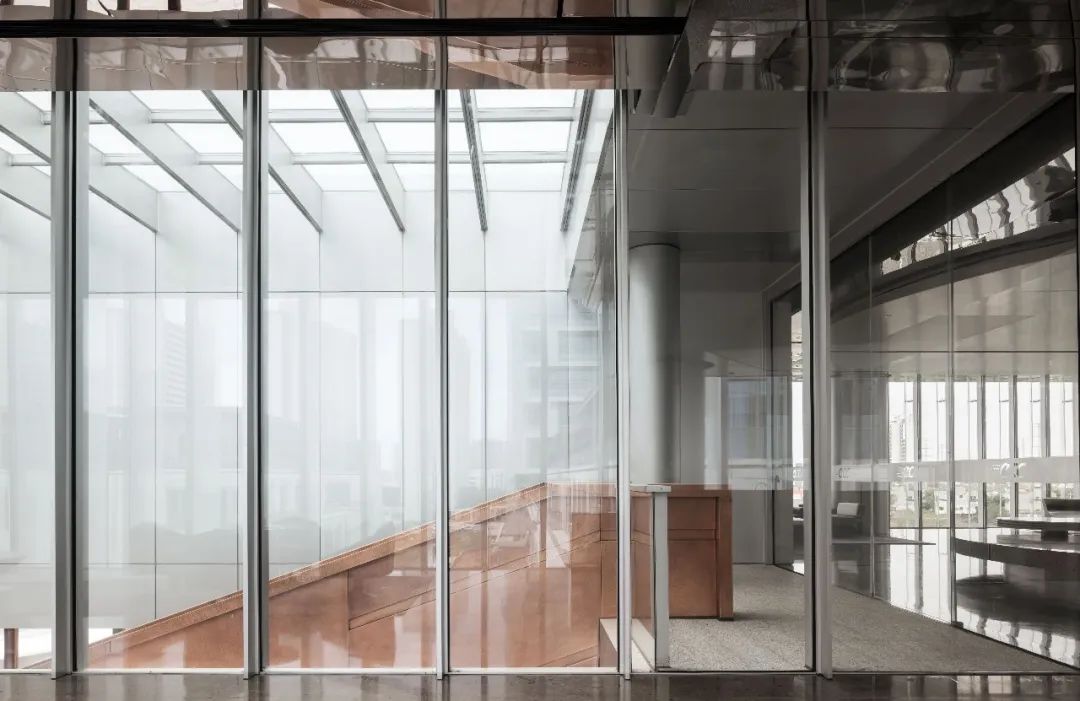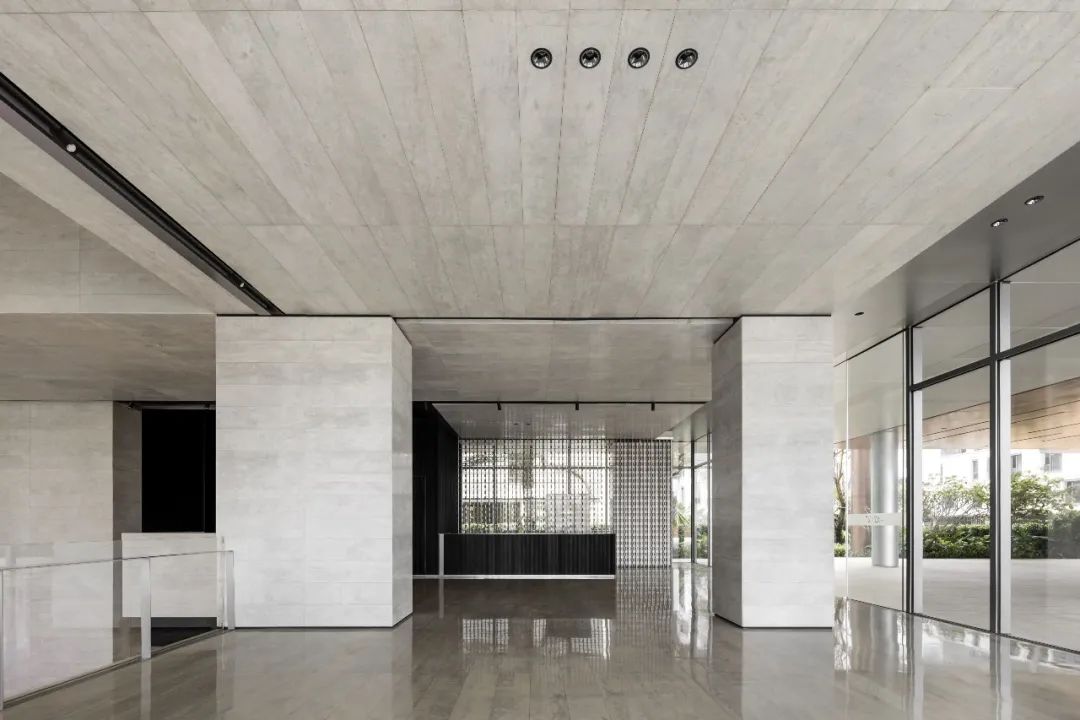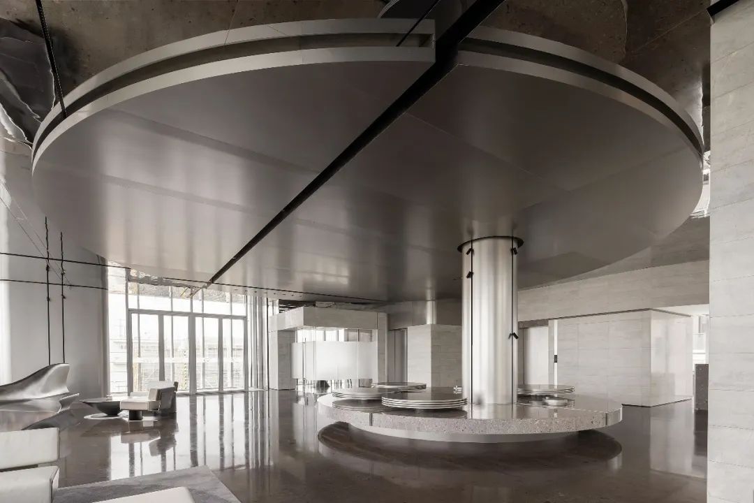设计师利用柱位增加灯具点位,有效减少顶部需要的灯具点位,从而保证顶面跟纯粹的镜面效果,顶面用了镜面不锈钢材质拉伸视觉层高,并通过蜂窝铝的材质复合让镜面得到尽可能的平整。 回应与共生 建筑设计留存了原始地形的记忆,构建了贴地生长,向自然延展的形态,回应了场地的阳光、微风。室内设计体现于建筑之内,也同样对内外做出了回应:结合主动开放的建筑思路,突出当代工业技术,将高科技工业和技术元素融入设计中加以着重表现;户外楼梯隐约展露于大厅与其它楼层的连接处,塑造视线与动线彼此交互的“戏剧化”场景,消弥了空间的边界感。 “光之于空间,就像声音之于音乐。建筑的体验,重叠的视角——这就相当于光中的空间声学。”通过前期与建筑公司的沟通,室内外的吊顶高度得以延续,We try to minimize the boundaries between the interior and exterior spaces of the building and introduce sunlight, greenery and rich landscaping to create a good public communication space.