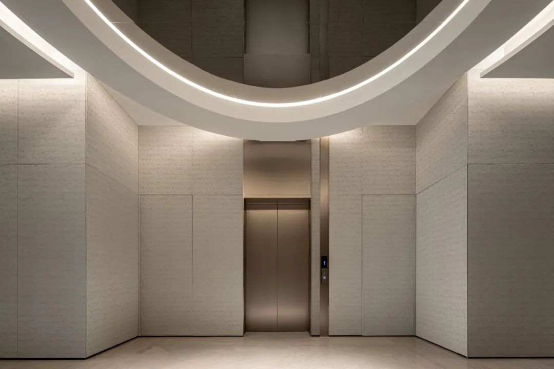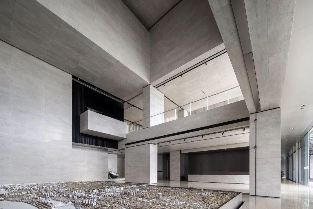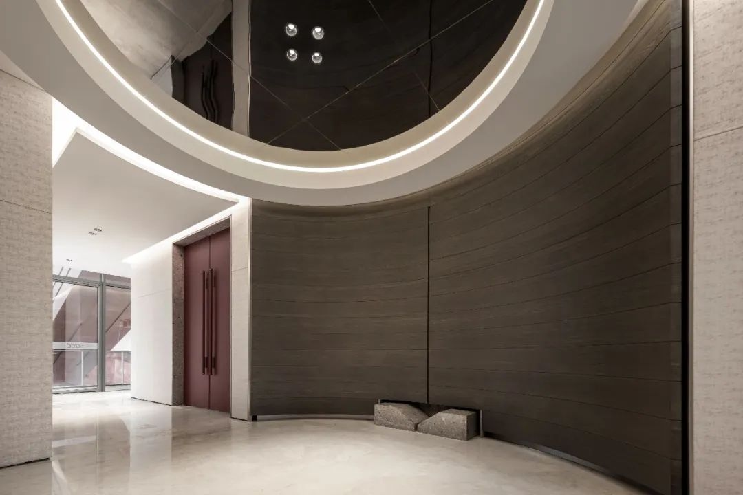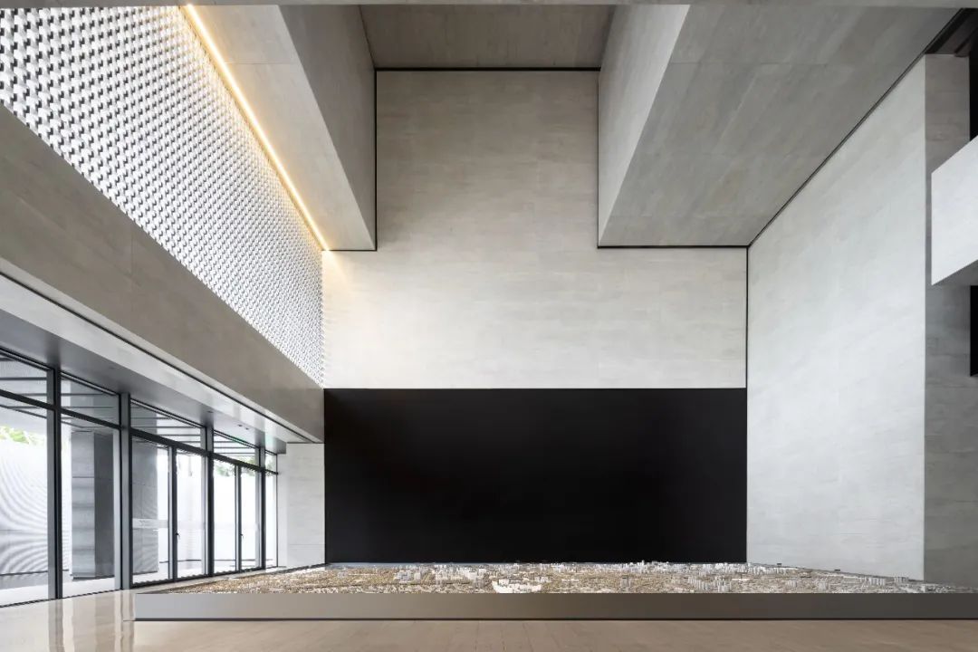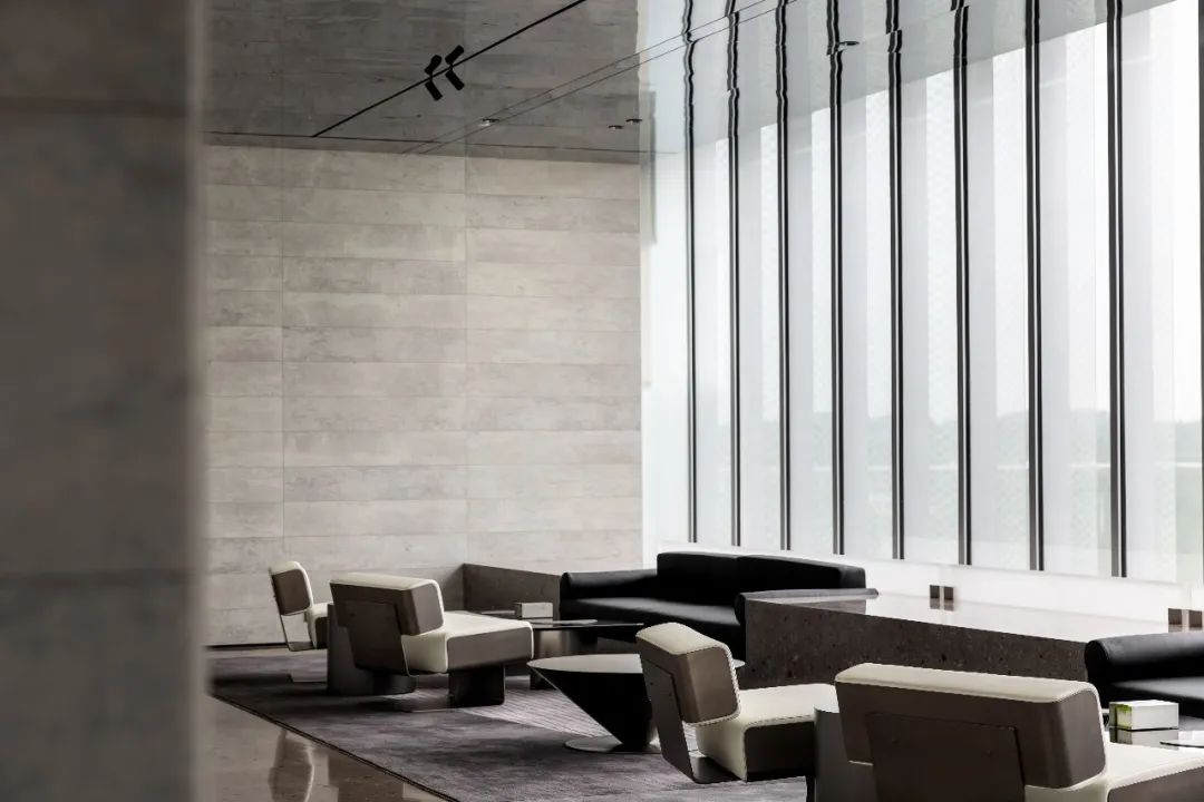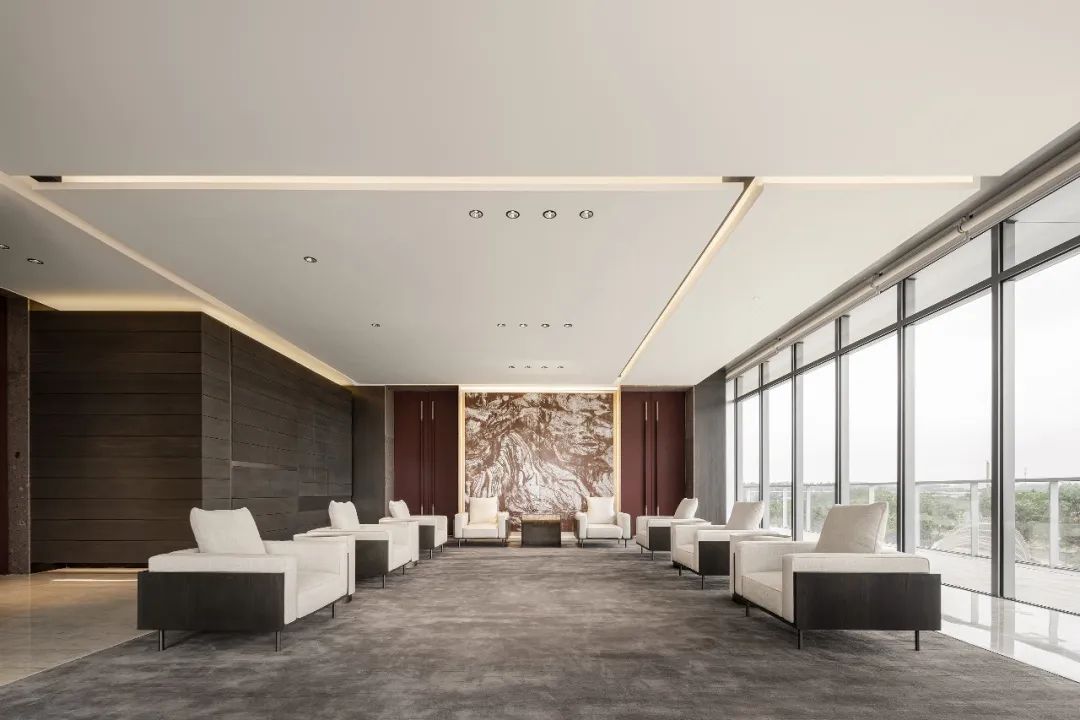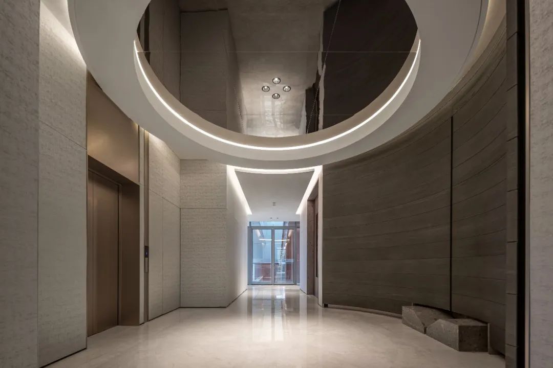 设计师利用柱位增加灯具点位,有效减少顶部需要的灯具点位,从而保证顶面跟纯粹的镜面效果,顶面用了镜面不锈钢材质拉伸视觉层高,并通过蜂窝铝的材质复合让镜面得到尽可能的平整。 回应与共生 建筑设计留存了原始地形的记忆,构建了贴地生长,向自然延展的形态,回应了场地的阳光、微风。室内设计体现于建筑之内,也同样对内外做出了回应:结合主动开放的建筑思路,突出当代工业技术,将高科技工业和技术元素融入设计中加以着重表现;户外楼梯隐约展露于大厅与其它楼层的连接处,塑造视线与动线彼此交互的“戏剧化”场景,消弥了空间的边界感。 “光之于空间,就像声音之于音乐。建筑的体验,重叠的视角——这就相当于光中的空间声学。”通过前期与建筑公司的沟通,室内外的吊顶高度得以延续,We try to minimize the boundaries between the interior and exterior spaces of the building and introduce sunlight, greenery and rich landscaping to create a good public communication space.