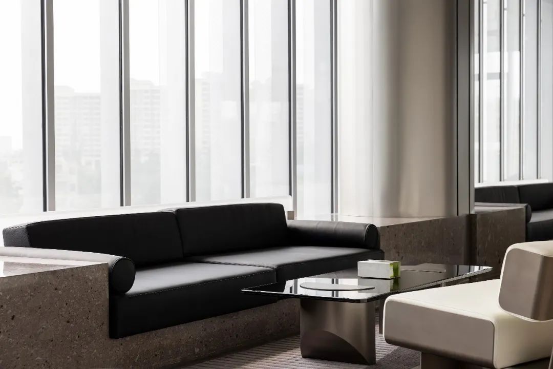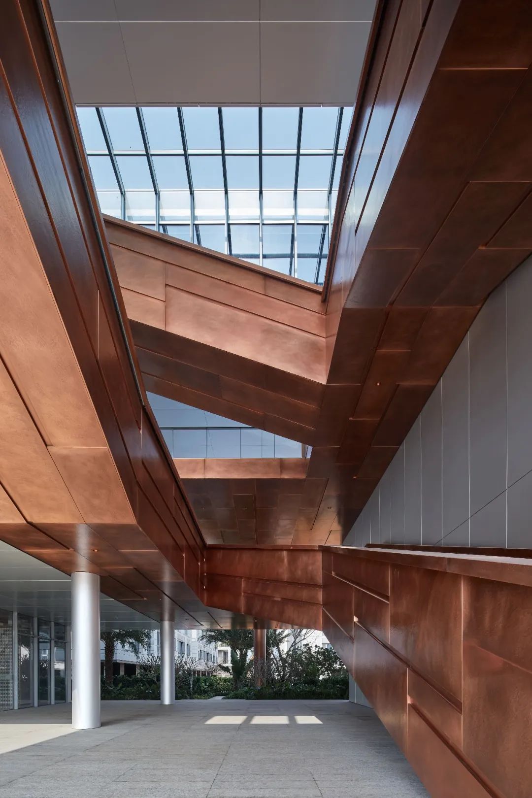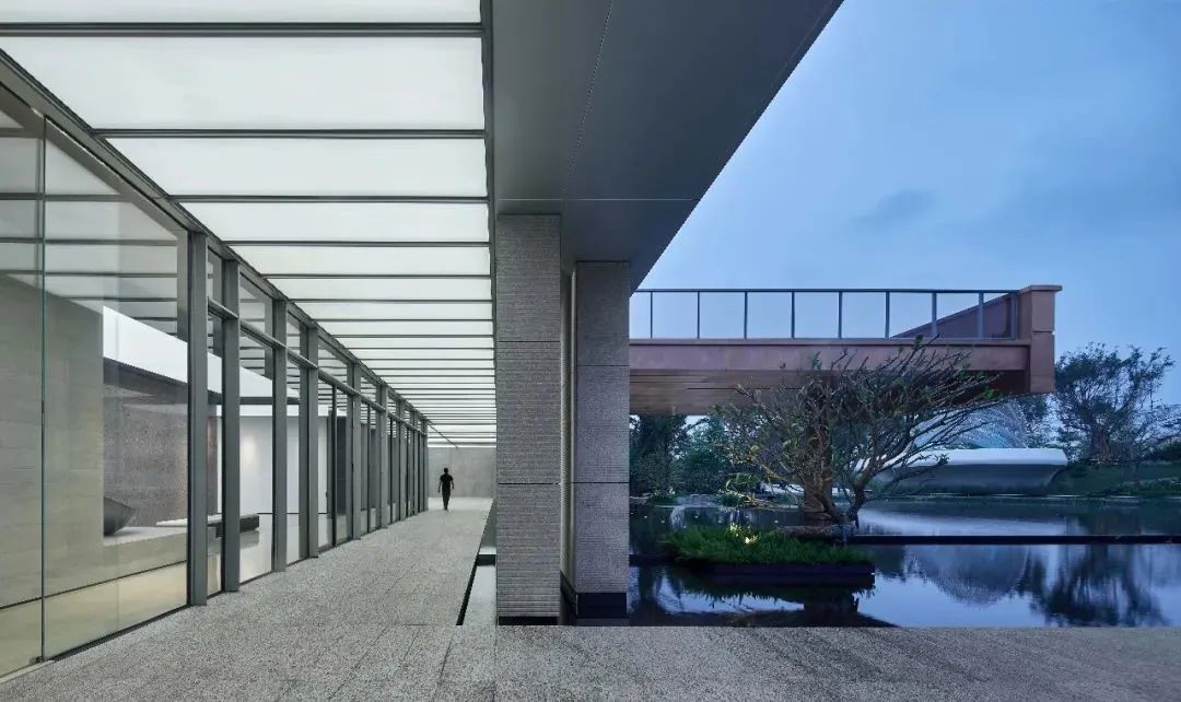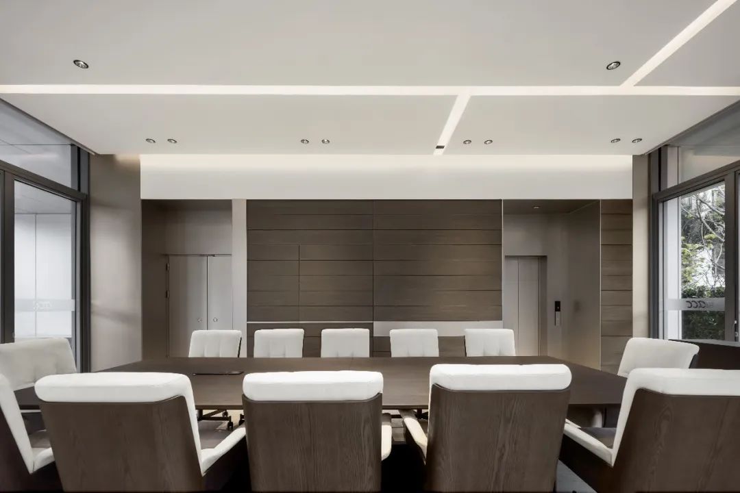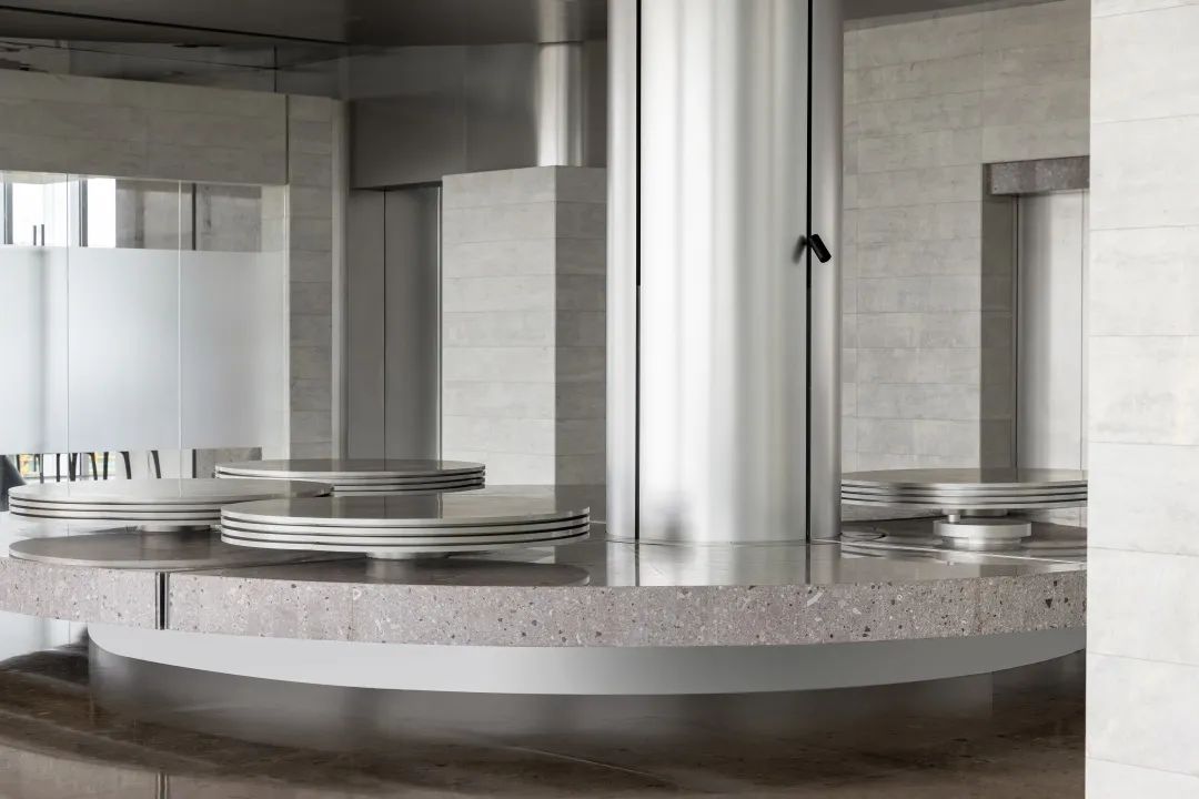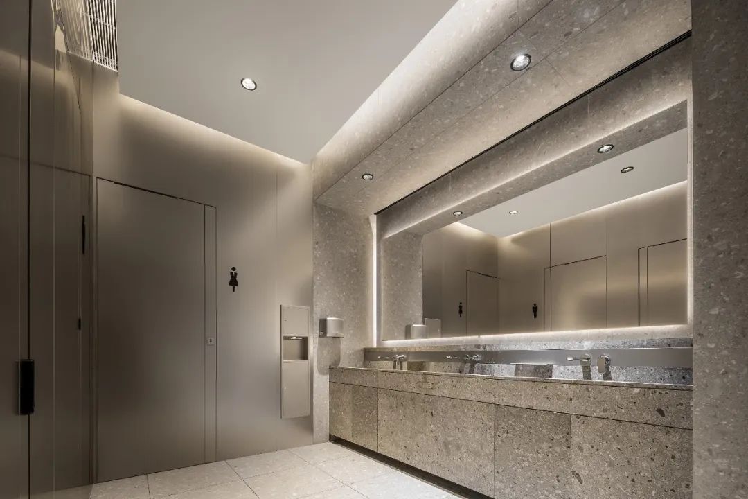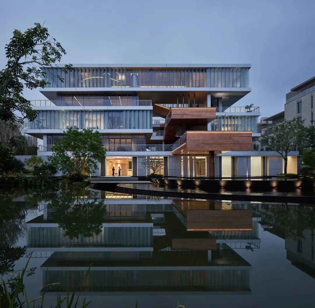 设计师利用柱位增加灯具点位,有效减少顶部需要的灯具点位,从而保证顶面跟纯粹的镜面效果,顶面用了镜面不锈钢材质拉伸视觉层高,并通过蜂窝铝的材质复合让镜面得到尽可能的平整。 回应与共生 建筑设计留存了原始地形的记忆,构建了贴地生长,向自然延展的形态,回应了场地的阳光、微风。室内设计体现于建筑之内,也同样对内外做出了回应:结合主动开放的建筑思路,突出当代工业技术,将高科技工业和技术元素融入设计中加以着重表现;户外楼梯隐约展露于大厅与其它楼层的连接处,塑造视线与动线彼此交互的“戏剧化”场景,消弥了空间的边界感。 “光之于空间,就像声音之于音乐。建筑的体验,重叠的视角——这就相当于光中的空间声学。”通过前期与建筑公司的沟通,室内外的吊顶高度得以延续,We try to minimize the boundaries between the interior and exterior spaces of the building and introduce sunlight, greenery and rich landscaping to create a good public communication space.