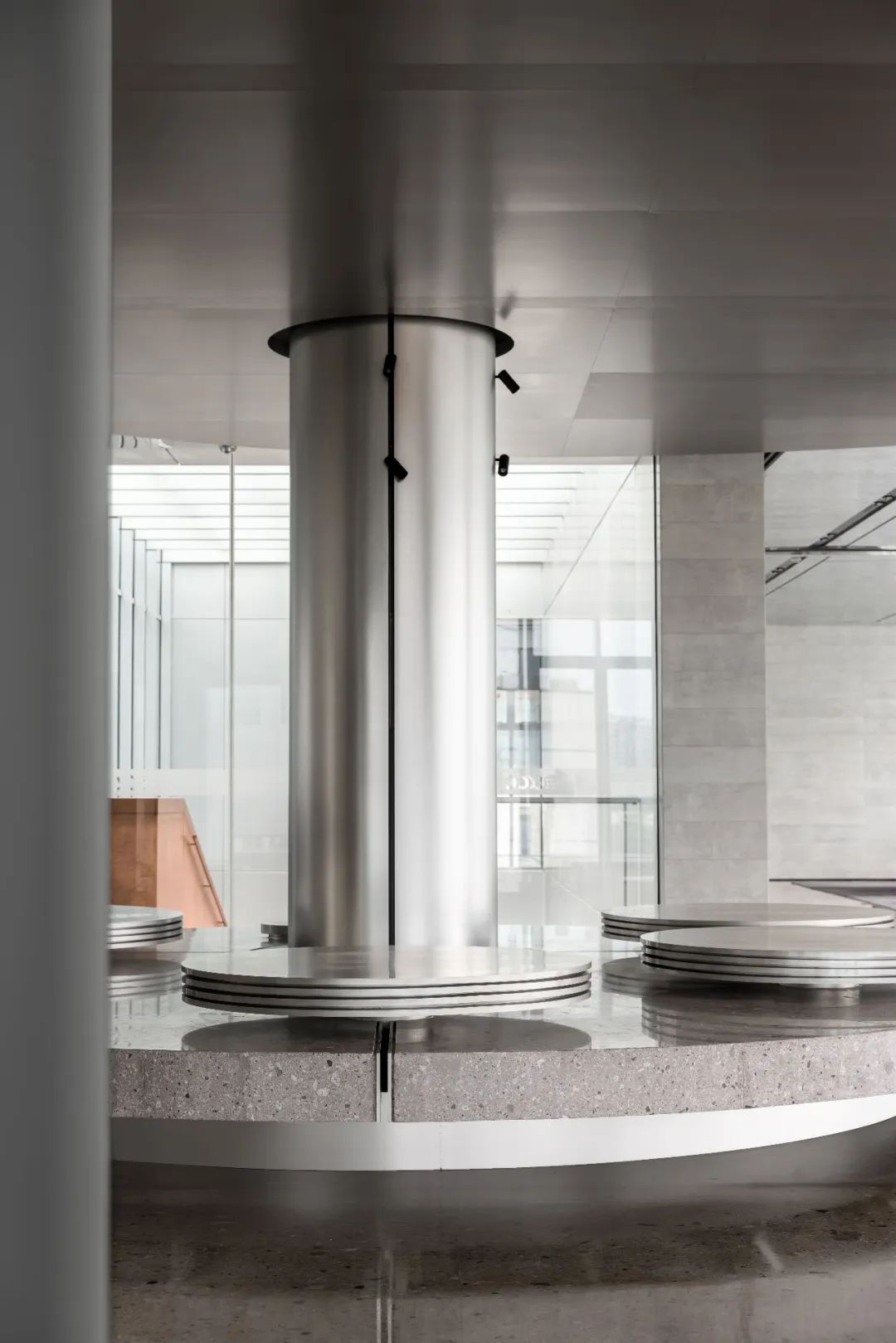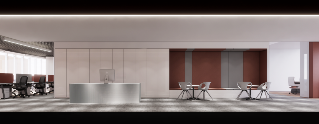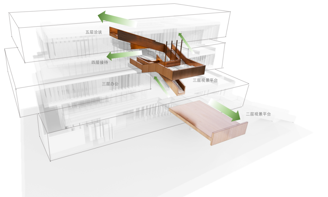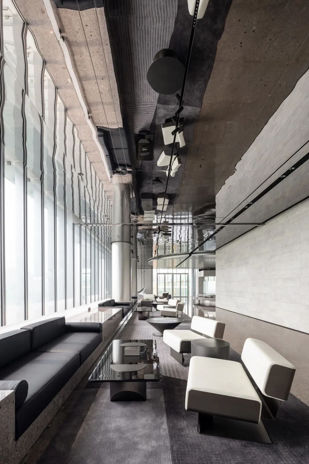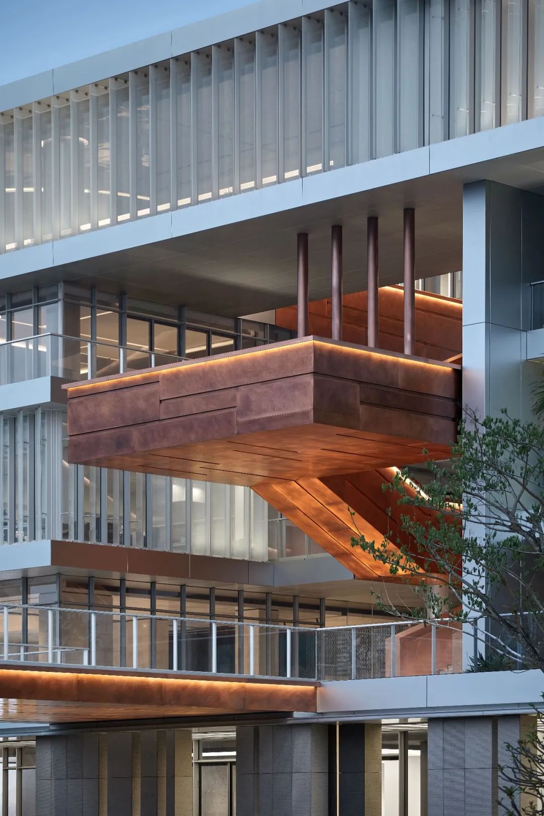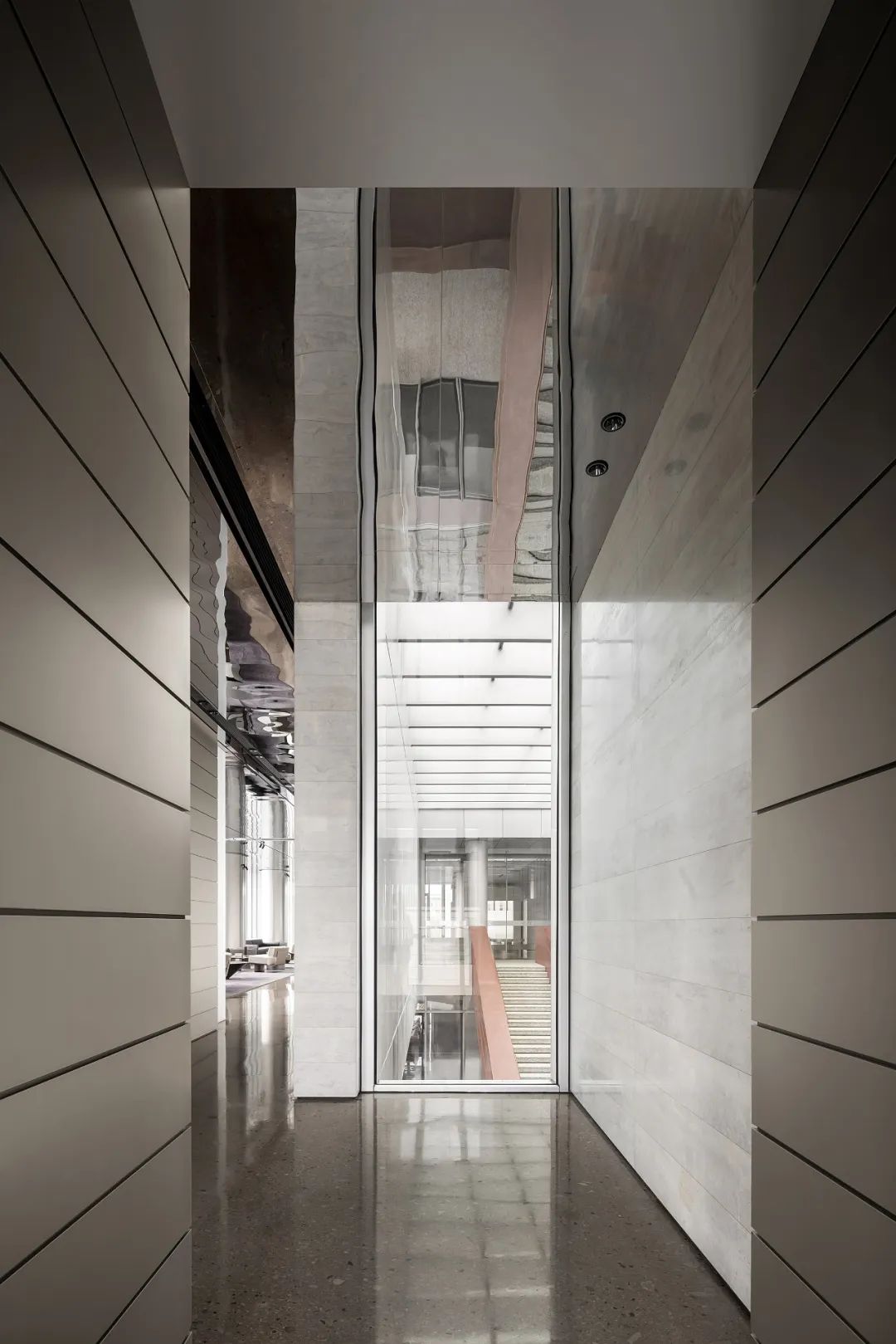 设计师利用柱位增加灯具点位,有效减少顶部需要的灯具点位,从而保证顶面跟纯粹的镜面效果,顶面用了镜面不锈钢材质拉伸视觉层高,并通过蜂窝铝的材质复合让镜面得到尽可能的平整。 回应与共生 建筑设计留存了原始地形的记忆,构建了贴地生长,向自然延展的形态,回应了场地的阳光、微风。室内设计体现于建筑之内,也同样对内外做出了回应:结合主动开放的建筑思路,突出当代工业技术,将高科技工业和技术元素融入设计中加以着重表现;户外楼梯隐约展露于大厅与其它楼层的连接处,塑造视线与动线彼此交互的“戏剧化”场景,消弥了空间的边界感。 “光之于空间,就像声音之于音乐。建筑的体验,重叠的视角——这就相当于光中的空间声学。”通过前期与建筑公司的沟通,室内外的吊顶高度得以延续,We try to minimize the boundaries between the interior and exterior spaces of the building and introduce sunlight, greenery and rich landscaping to create a good public communication space.