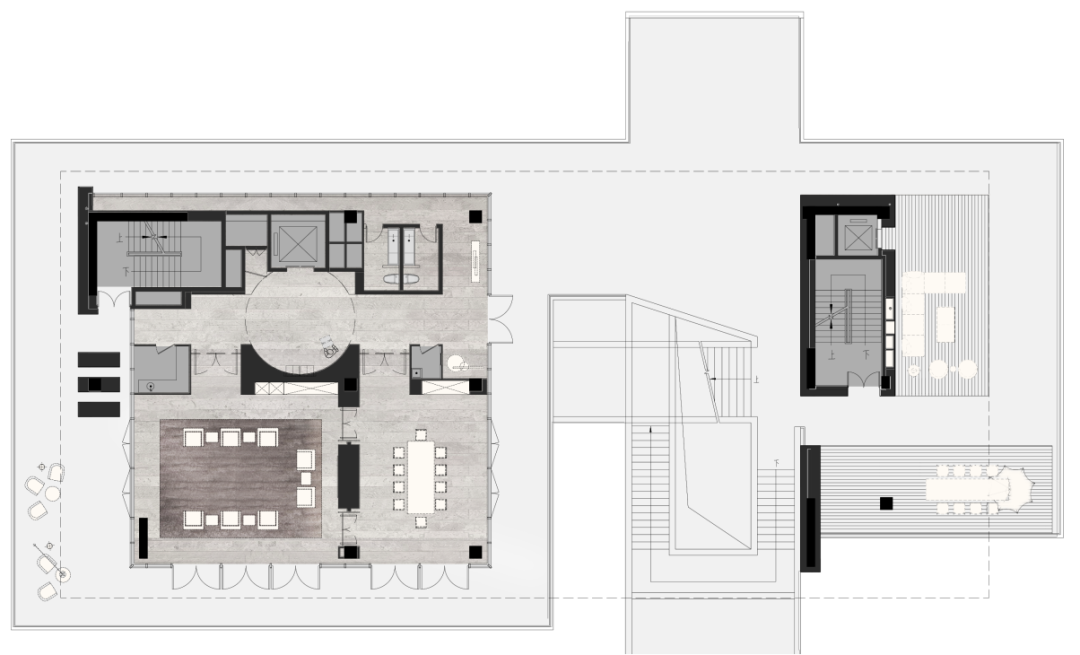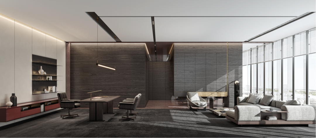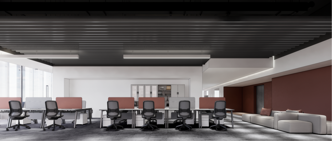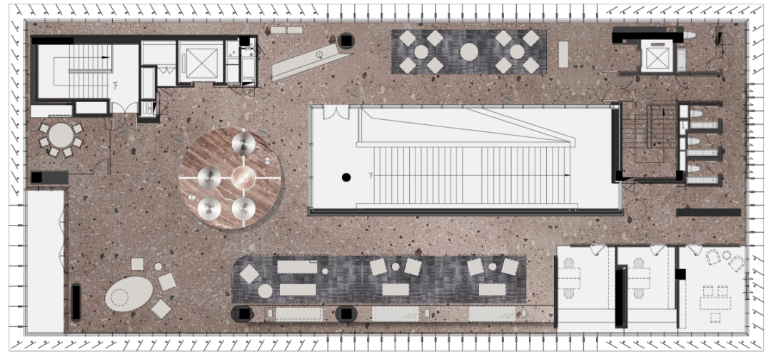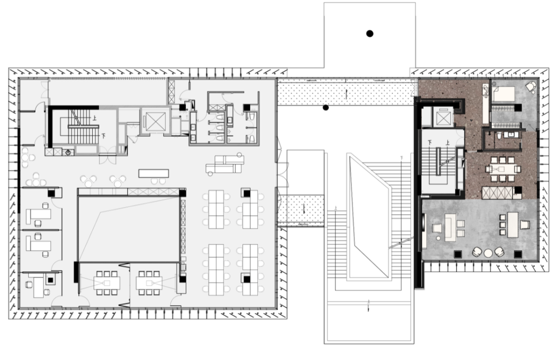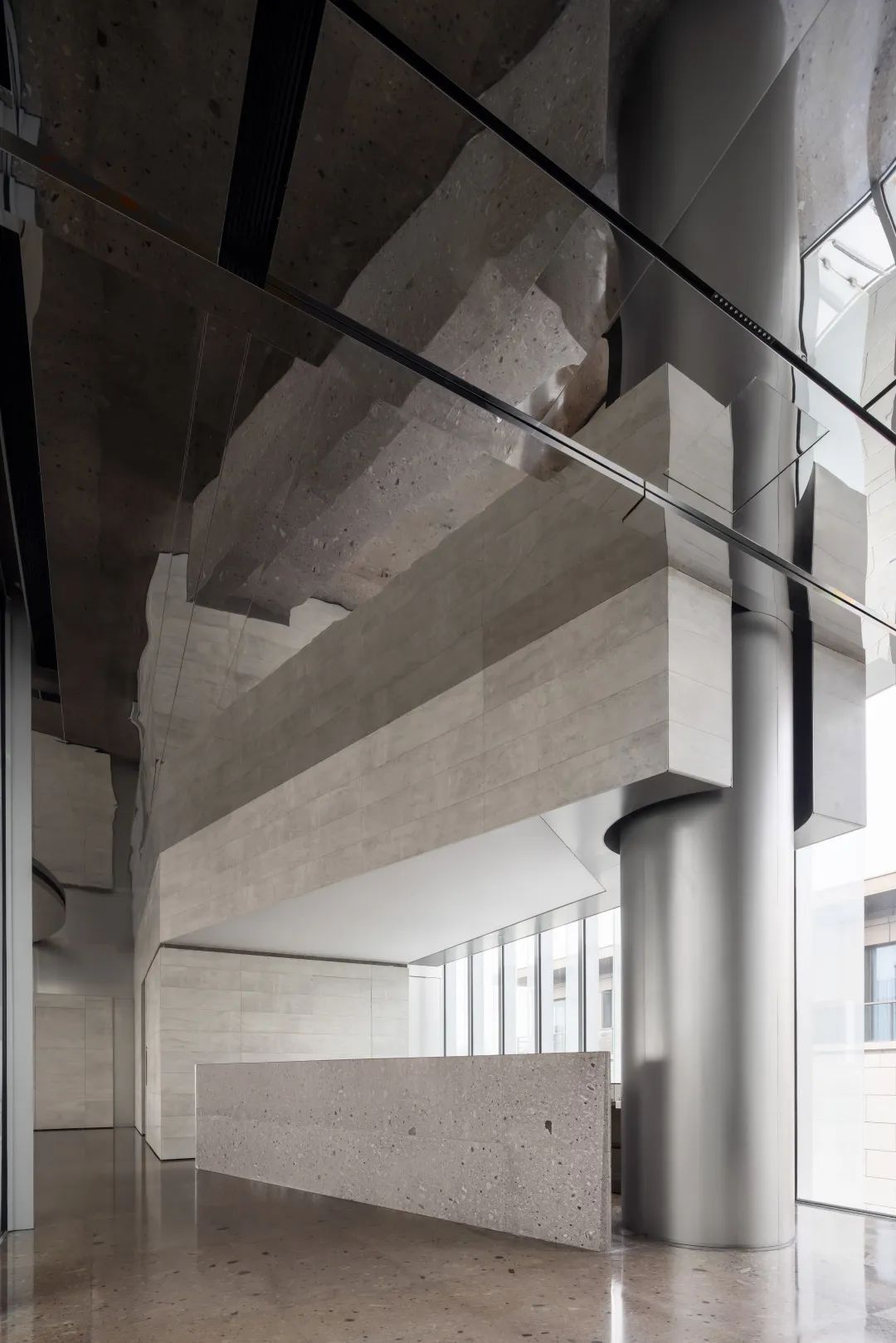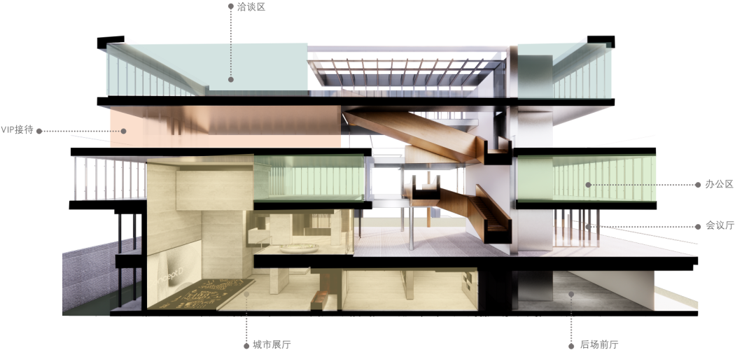 设计师利用柱位增加灯具点位,有效减少顶部需要的灯具点位,从而保证顶面跟纯粹的镜面效果,顶面用了镜面不锈钢材质拉伸视觉层高,并通过蜂窝铝的材质复合让镜面得到尽可能的平整。 回应与共生 建筑设计留存了原始地形的记忆,构建了贴地生长,向自然延展的形态,回应了场地的阳光、微风。室内设计体现于建筑之内,也同样对内外做出了回应:结合主动开放的建筑思路,突出当代工业技术,将高科技工业和技术元素融入设计中加以着重表现;户外楼梯隐约展露于大厅与其它楼层的连接处,塑造视线与动线彼此交互的“戏剧化”场景,消弥了空间的边界感。 “光之于空间,就像声音之于音乐。建筑的体验,重叠的视角——这就相当于光中的空间声学。”通过前期与建筑公司的沟通,室内外的吊顶高度得以延续,We try to minimize the boundaries between the interior and exterior spaces of the building and introduce sunlight, greenery and rich landscaping to create a good public communication space.