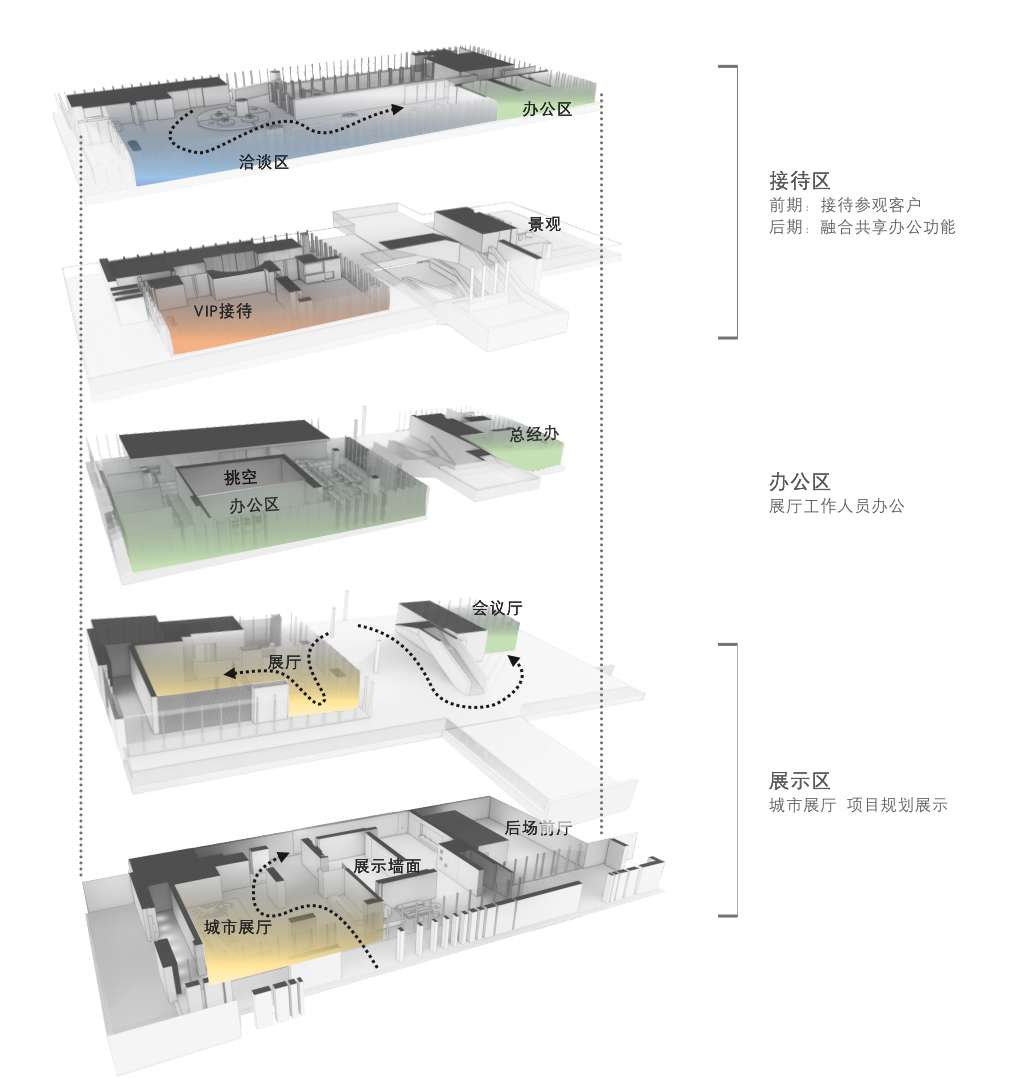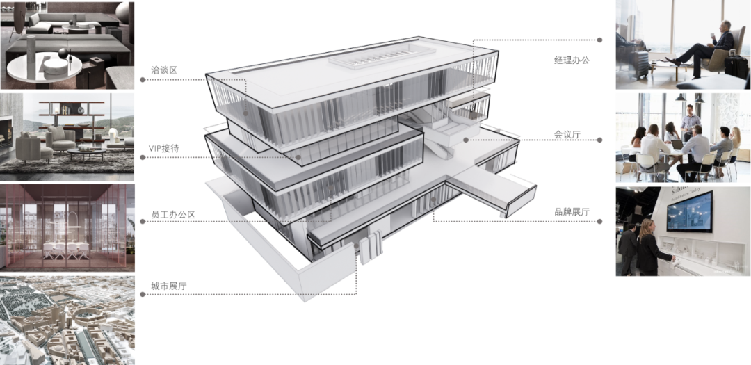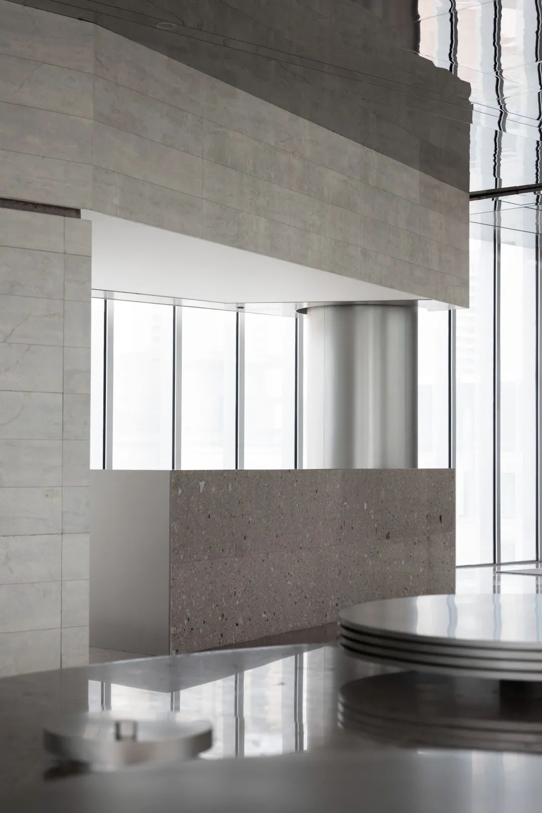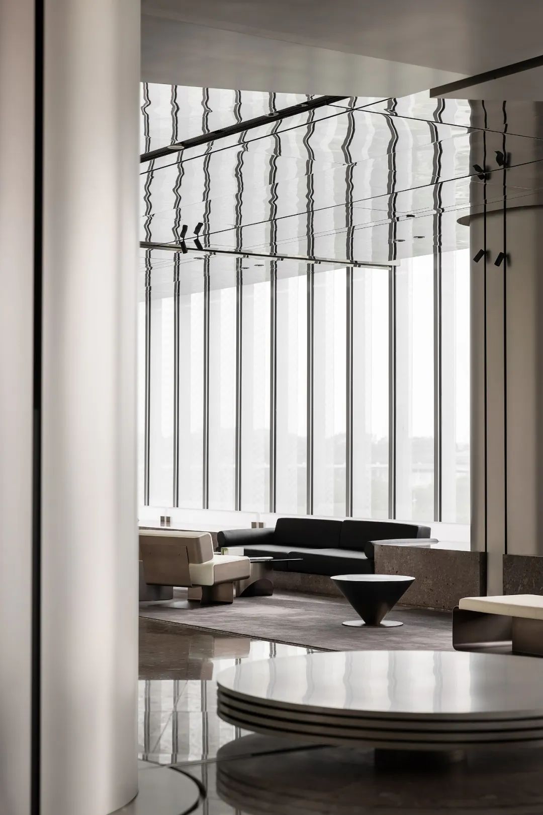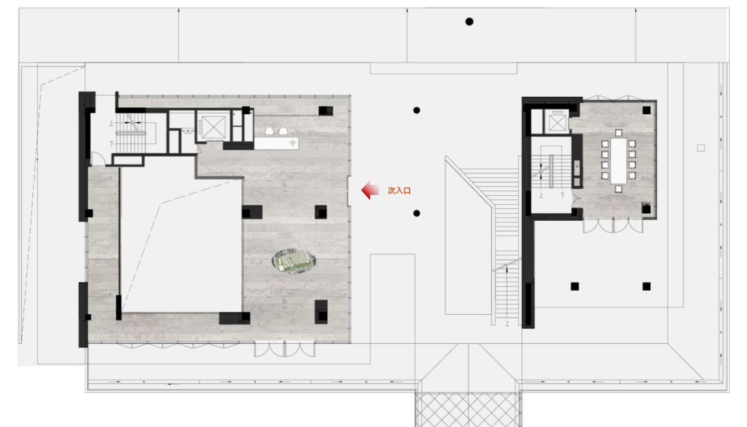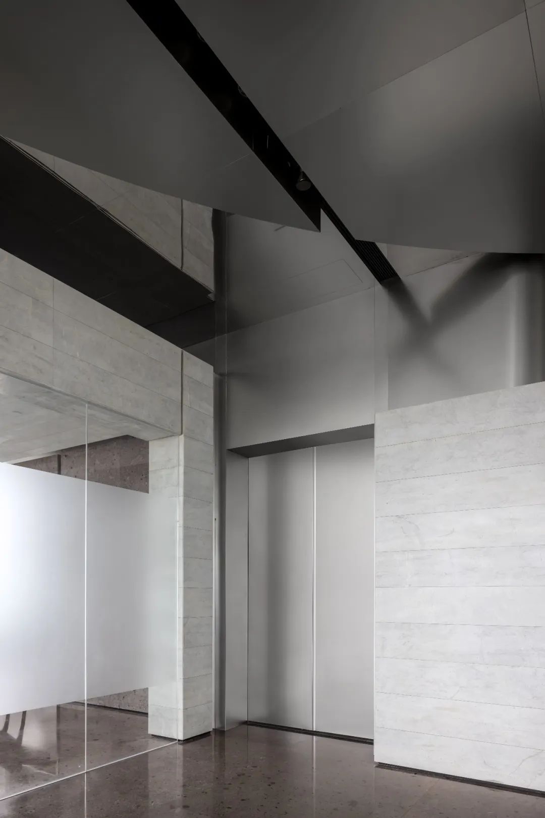 设计师利用柱位增加灯具点位,有效减少顶部需要的灯具点位,从而保证顶面跟纯粹的镜面效果,顶面用了镜面不锈钢材质拉伸视觉层高,并通过蜂窝铝的材质复合让镜面得到尽可能的平整。 回应与共生 建筑设计留存了原始地形的记忆,构建了贴地生长,向自然延展的形态,回应了场地的阳光、微风。室内设计体现于建筑之内,也同样对内外做出了回应:结合主动开放的建筑思路,突出当代工业技术,将高科技工业和技术元素融入设计中加以着重表现;户外楼梯隐约展露于大厅与其它楼层的连接处,塑造视线与动线彼此交互的“戏剧化”场景,消弥了空间的边界感。 “光之于空间,就像声音之于音乐。建筑的体验,重叠的视角——这就相当于光中的空间声学。”通过前期与建筑公司的沟通,室内外的吊顶高度得以延续,We try to minimize the boundaries between the interior and exterior spaces of the building and introduce sunlight, greenery and rich landscaping to create a good public communication space.